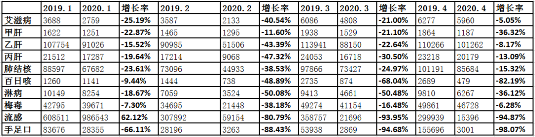 新冠疫情的此起彼伏,让口罩成了一个必备生活用具。慢慢的很多人都习惯了这种疫情之下的新常态生活,而“戴口罩”不仅可以预防新冠病毒,对于其他经呼吸道传播的传染病也具有一定的预防作用。 本平台整理了常见的甲类和乙类传染病的2019年1-4月和2020年1-4月的发病率情况: 艾滋病 艾滋病是一种危害性极大的传染病,由感染艾滋病病毒(HIV病毒)引起。HIV是一种能攻击人体免疫系统的病毒。它把人体免疫系统中最重要的CD4T淋巴细胞作为主要攻击目标,大量破坏该细胞,使人体丧失免疫功能。因此,人体易于感染各种疾病,并可发生恶性肿瘤,病死率较高。HIV在人体内的潜伏期平均为8~9年。 甲型肝炎 甲型病毒性肝炎,简称甲型肝炎、甲肝,是由甲型肝炎病毒(HAV)引起的,以肝脏炎症病变为主的传染病,主要通过粪-口途径传播,临床上以疲乏,食欲减退,肝肿大,肝功能异常为主要表现,部分病例出现黄疸,主要表现为急性肝炎,无症状感染者常见。任何年龄均可患本病,但主要为儿童和青少年。 乙型肝炎 乙型病毒性肝炎(viral hepatitis type B)是由乙型肝炎病毒引起的以肝脏病变为主的一种传染病。临床上以食欲减退、恶心、上腹部不适、肝区痛、乏力为主要表现。部分患者可有黄疸发热和肝大伴有肝功能损害。有些患者可慢性化,甚至发展成肝硬化,少数可发展为肝癌。 丙型肝炎 丙型病毒性肝炎,简称为丙型肝炎、丙肝,是一种由丙型肝炎病毒(HCV)感染引起的病毒性肝炎,主要经输血、针刺、吸毒等传播,据世界卫生组织统计,全球HCV的感染率约为3%,估计约1.8亿人感染了HCV,每年新发丙型肝炎病例约3.5万例。 丙型肝炎呈全球性流行,可导至肝脏慢性炎症坏死和纤维化,部分患者可发展为肝硬化甚至肝细胞癌(HCC)。 肺结核 结核病是由结核分枝杆菌引起的慢性传染病,可侵及许多脏器,以肺部结核感染最为常见。排菌者为其重要的传染源。人体感染结核菌后不一定发病,当抵抗力降低或细胞介导的变态反应增高时,才可能引起临床发病。若能及时诊断,并予合理治疗,大多可获临床痊愈。 百日咳 百日咳是一种由百日咳杆菌引起的急性呼吸道传染病,自从广泛实施百日咳菌苗免疫接种后,本病的发生率已经大为减少。百日咳的临床特征为咳嗽逐渐加重,呈典型的阵发性、痉挛性咳嗽,咳嗽终末出现深长的鸡啼样吸气性吼声,病程长达2~3个月,故有百日咳之称。 淋病 淋病是由淋病奈瑟菌(淋球菌)感染所引起的一种疾病,主要表现为泌尿生殖系统黏膜的化脓性炎症。男性常表现为急性尿道炎,而女性则为宫颈炎。此外,咽部、直肠和眼结膜也可出现感染。 梅毒 梅毒是由苍白(梅毒)螺旋体引起的慢性、系统性性传播疾病。主要通过性途径传播,临床上可表现为一期梅毒、二期梅毒、三期梅毒、潜伏梅毒和先天梅毒(胎传梅毒)等。是《中华人民共和国传染病防治法》中,列为乙类防治管理的病种。 |