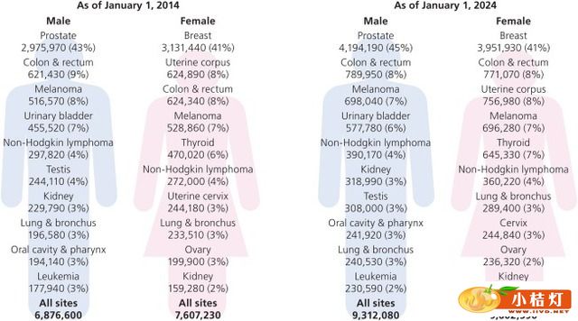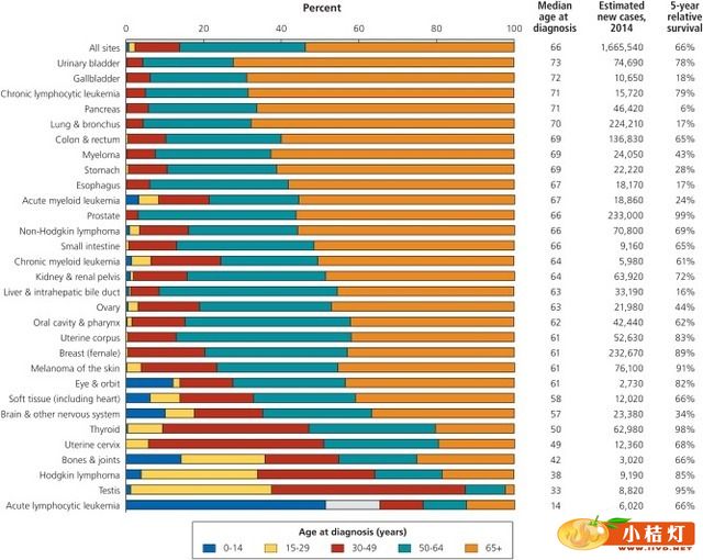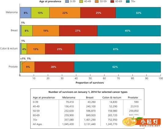日前,CA Cancer J Clin杂志在线版发表了美国癌症协会2014—2015年癌症治疗和生存数据统计评估结果,数据显示,目前美国癌症幸存者数量约为1450万人,预计这一数字会在2024年增长为近1900万人。在美国,最近的十年间癌症发病率持续下降,癌症幸存者的数量也越来越多。 来源:美国国家癌症研究所 癌症控制与人口科学部 数据建模部 由于四舍五入,各比例数据之和可能不等于100% 大多数癌症幸存者(64%)生存时间超过5年,15%的癌症幸存者生存时间超过20年。近一半癌症幸存者(46%)年龄不低于70岁,而5%的癌症幸存者年龄在40岁以下。不同癌症类型的幸存者年龄分布差异很大。例如,大多数前列腺癌幸存者(62%)年龄在70岁及以上,而这个年龄组的黑色素瘤幸存者则只占不到三分之一。 注:排名顺序是按照诊断时的平均年龄从大到小排列。来源:年龄分布基于2009~2010年北美中央癌症登记协会的数据,不包括阿肯色州,内华达州,和俄亥俄州。诊断时的年龄中位数和5年相对存活率是基于在2006至2010年和2003至2009年的诊断病例的数据,分别从监测、流行病学和最终结果(SEER)登记处和以前出版的howlader等的研究数据。2014年评估病例来源于Siegel等的数据。 评估显示,2014年,对于男性而言,三种最常见癌症分别是前列腺癌(43%),结肠癌(9%),和黑色素瘤(8%)。女性人群中最常见的三种癌症分别是乳腺癌 (41%),子宫颈癌(8%)和结肠癌(8%)。肺癌是癌症死亡的主要原因,同时是男性和女性第二个最常见癌症诊断类型,由于肺癌的存活率非常之低,因而肺癌幸存者仅处于第8位。 除患病率预测评估之外,该项报告的数据还涉及到癌症治疗模式,生存期,以及已选定癌症治疗和常见癌症短期和长期疗效信息。癌症治疗和生存事实数据 (Cancer Treatment & Survivorship Facts & Figures)的部分章节还涉及到癌症疗效和其治疗方案,减值驱动的癌症康复,姑息治疗,长期生存,健康行为获益等,数据来自美国癌症学会和其他机构的 癌症幸存者相关资源。 RT表示放射治疗;chemo表示化疗(包括免疫治疗和靶向治疗)。资料来源:国家癌症数据库,2011年 RT表示放射治疗;chemo表示化疗(包括免疫治疗和靶向治疗)。资料来源:国家癌症数据库,2011年 化疗包括免疫治疗和靶向治疗。ALL 提示为急性淋巴细胞性白血病;CLL为慢性淋巴细胞性白血病;ALL为急性髓细胞白血病,CML为慢性粒细胞白血病。资料来源:国家癌症数据库,2011年 RT表示放射治疗;chemo表示化疗(包括免疫治疗和靶向治疗)。资料来源:国家癌症数据库,2011年 RT表示放射治疗;chemo表示化疗(包括免疫治疗和靶向治疗)。资料来源:国家癌症数据库,2011年 RT表示放射治疗。缺失治疗数据的患者被排除在外。风险分类基于对前列腺癌国家综合癌症网络临床实践指南。来源:监测、流行病学和最终结果(SEER)注册研究,美国国家癌症研究所癌症控制与人口科学部 RT表示放射治疗;chemo表示化疗(包括免疫治疗和靶向治疗)。资料来源:国家癌症数据库,2011年 化学表明化疗(包括免疫治疗和靶向治疗);RPLND表示腹膜后淋巴结清扫术;RT,放射治疗。资料来源:国家癌症数据库,2011年 RT表示放射治疗;Chemo表示化疗(包括免疫治疗和靶向治疗);TURBT表示经尿道膀胱肿瘤切除术。资料来源:国家癌症数据库,2011年 RT表示放射治疗;Chemo表示化疗(包括免疫治疗和靶向治疗)。 |