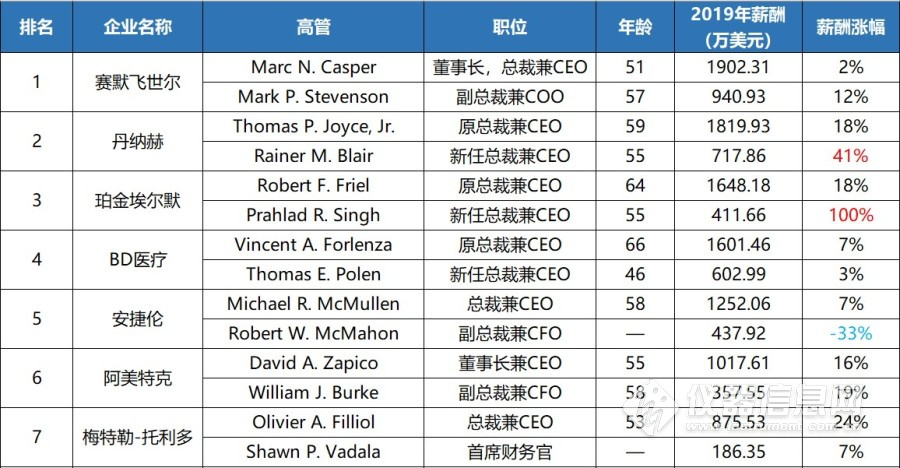 2019年度科学仪器CEO薪酬排行榜 图片来源:仪器信息网 2019年全球科学仪器市场面临重重挑战,榜单中7位仪器企业CEO的薪酬逆风飞扬,实现双位数增长;5位收入微增;另有3位薪酬下跌,其中Illmina、沃特世两家公司高管的收入跌幅超过80%。相比之下Illumina老板的日子似乎不太好过,消费者(DTC)业务疲软,收购PacBio计划落空,多重打击让Illmina高管蒙受损失,首席运营官Omead Ostadan也于近日离开公司。