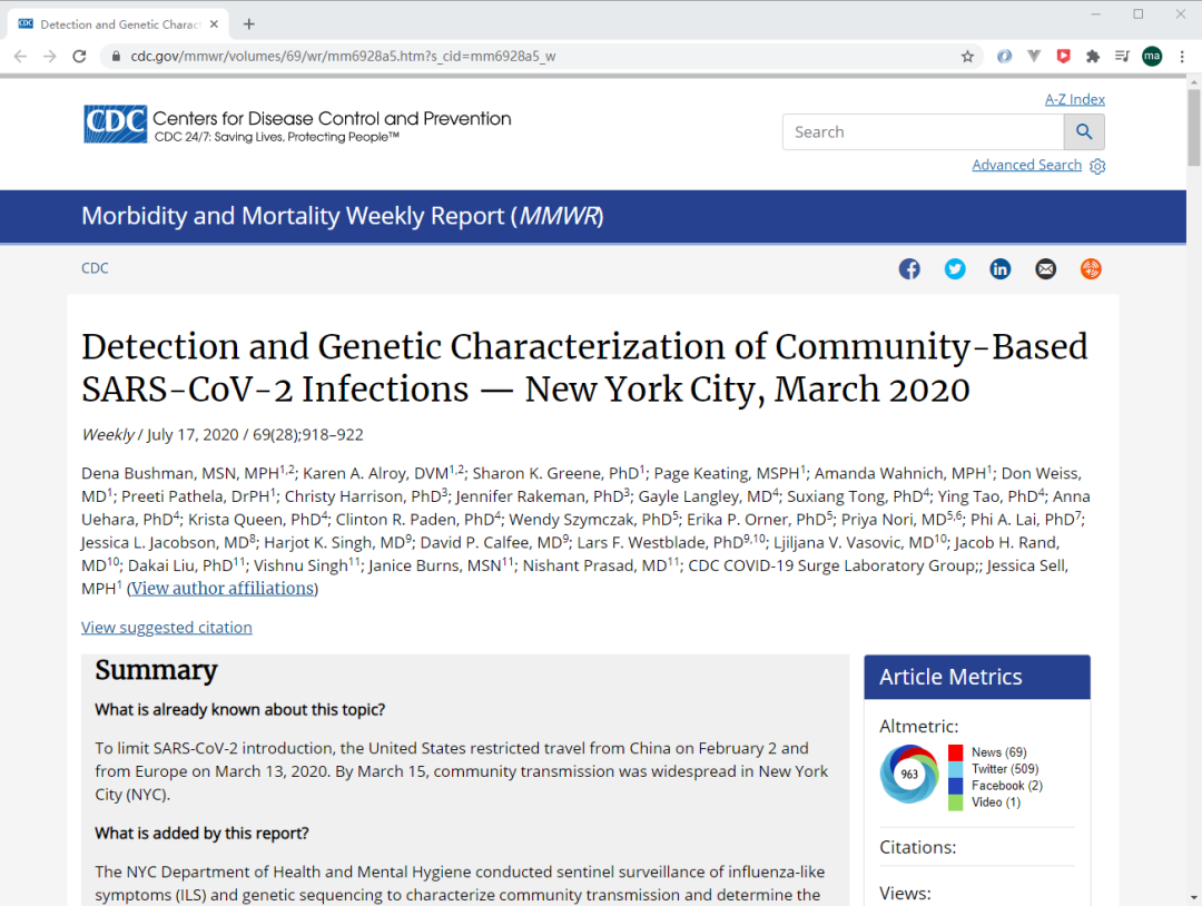 美国疾控中心 (以下简称美CDC) 于2020.7.17日傍晚,在其官网www.cdc.gov 发布了一篇关于美国新型冠状病毒肺炎的样本溯源分析报告。报告用翔实的证据和数据,证明了美国的新冠疫情爆发: