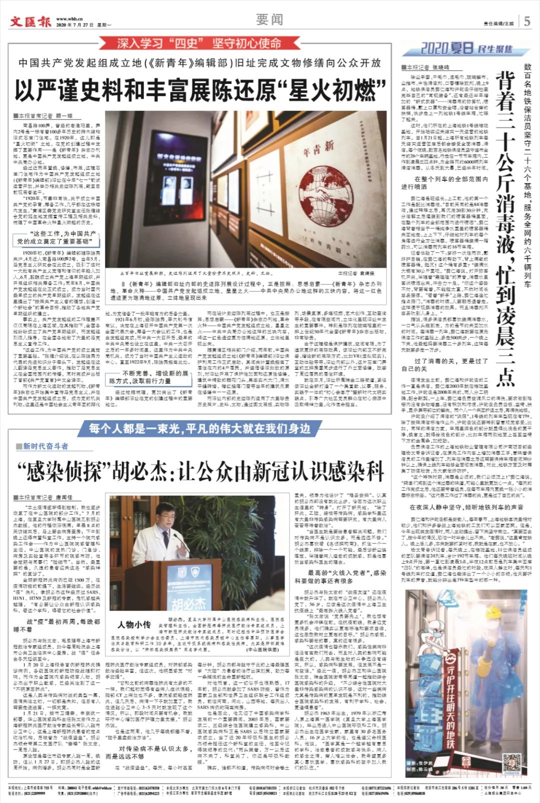 【人物小传】 胡必杰,复旦大学附属中山医院感染病科主任、医院感染管理科主任,全国新冠病毒肺炎医疗救治专家组成员、上海市新冠肺炎救治专家组成员,同时还担任中华预防医学会医院感染控制学分会主任委员、上海市院内感染质控中心主任等要职,从事医学临床与教育科研工作30多年,主攻呼吸系统疾病和感染性疾病,尤其是肺部疑难感染诊治,以“肺部感染探案录”闻名学术圈。 “本土疫情逐渐得到控制,我也逐步恢复了在中山医院的部分工作。”7月的上海,在复旦大学附属中山医院见到胡必杰教授,他的行程依旧很满:早晨8点的采访结束后,马上要去病房查房;下午到晚上还得布置科室工作,主持一个院内感染工作会——作为中山医院院感管理科主任,中山医院的发热门诊、门急诊、病房及实验室等各环节的院感布防,他会定期与同事们“碰细节”。 当然,最重要的是,久违的患者迎来这名 “感染神探”的复诊。 全球新冠肺炎病例已破1500万,在疫情防控的前提下,生活要继续。经历战“疫”洗礼,像胡必杰这种经历过SARS、H1N1、H7N9及新冠的专家,危机感越来越强,“有必要让公众由新冠认识感染科,看这个学科,得看它的社会价值”。 战“疫”最初两周,每晚都睡不着 胡必杰与张文宏、毛恩强等上海市新冠救治专家组成员,如今每周轮流去上海市公共卫生临床中心查房,战“疫”任务由冬天延续至今。 1月20日上海报告首例新冠肺炎确诊病例,各级医院的新冠防控战随即打响。而作为全国院内感染领军人物,胡必杰出于职业敏感,已经关注到了这一“不明原因肺炎”。 这是人类与传染病对战的典型一幕,疫情来临之初,一切都是未知,但总有人需要走进迷雾,一探究竟。 1月21日,按市卫健委、申康统一部署,华山医院感染科主任张文宏作为上海新冠肺炎医疗救治专家组长带队入驻市公卫中心,这是上海新冠肺炎患者的定点收治机构,后被誉为“战疫堡垒”。胡必杰领命带第二支医疗队“接棒”张文宏,一周后入驻。 原设想是每位市级专家入驻一周,换防,但从1月27日,即胡必杰入驻的这周开始,病例增多。 胡必杰同时是全国新冠肺炎医疗救治专家组成员,对肺部感染救治经验丰富,但这次,他明显感觉“对手狡猾”。 “它和之前的病毒性肺炎有太多的不一样,我们起初觉得有些病人症状很轻,胸部CT上病灶也不多,像流感或轻症肺炎,但几天后,病情一下子就加重了。我在进驻公卫中心3-5天时就发现了这个情况,所以,那段时间只要有机会,我就呼吁中心增加医疗护理力量支援。”胡必杰说。 也是这两周,他几乎每晚都睡不着,“脑子里盘救治方法”。 对传染病不是认识太多,而是远远不够 在“战疫堡垒”,每天、每小时甚至每分钟,胡必杰都与驻守于此的上海最强医学“大脑”为患者的治疗出谋划策,助力每一条搁浅的生命重新起航。 对他而言,这一切似乎也很熟悉,17年前,胡必杰就参加了SARS防控,曾作为国家卫生部和世界卫生组织联合工作组成员,前往河南、河北、山西等地,每天出入SARS病例的隔离病房。 也是因此,他见证了中国感染病学科发展的一个重要瞬间。 2003年后,国家要求二、三级综合性医院建立感染科,中山医院感染病科正是SARS以后响应国家要求成立。当了近20年呼吸科医生的胡必杰领命担任这个新科室的主任,他至今记得院领导的交代:“两头兼着,万一以后这病不来了,科室关了,你还是呼吸科教授。” 确实,谁都不知道,传染病何时会卷土重来,领导为他设计了“稳妥安排”。 认真的胡必杰却没有就此止步,恰因为这次职业生涯里的“转身”,打开了新天地,“除了肝炎、乙脑、结核等传染病,感染学科里还有大量非传染感染病需要研究,有大量病人苦苦等待着救治”。 胡必杰救治过一名血液科的女病人,26岁,入院时的诊断是“淋巴瘤待排”。短短4个月,女孩的体重骤降12斤,衬衫显得空落落的。女孩辗转从外地赶来,已做了一堆检查,几家医院得出的结论都是:食道癌全身转移,没有手术机会。 年纪轻轻,得到这样一个结果,可想见就诊时的表情,绝望,惊恐,焦灼。 血液科请胡必杰会诊的原因是:T-Spot阳性,一个不显眼、也不确定的指标。 “家里从来不养宠物,也不爱吃生鱼片”“没去过北方,不可能接触牛羊什么的”“不发烧,但觉得很虚,动动就冒汗”……胡必杰的问诊很细。他笑言,感染科医生问病史有时就这么“八卦”,把病人的嗜好、药物、工作、家庭等一一问遍。 正是这次问诊,胡必杰打出会诊记录:考虑结核可能大,建议抗结核治疗! 原来,女孩在交谈时指着室友的照片说了一句,“她半年前咯血了,据说是肺结核。” “开放性肺结核病人密切接触史”!很快,检查、治疗证实了这个判断,10天后,女孩的吞咽痛、进食哽咽感明显缓解。 “医生,我太高兴了!”当女孩再次出现在胡必杰面前,脸蛋白里透红,眼睛好像在发光。 “你肯定没见过这么高兴的‘绝症’患者,10天之内,那种生命的活力回来了。”在胡必杰这里,这样的病例太多了。他主持的“SIFIC”感染官微上——这是中国感染/院感专家最大的交流平台,专门有一个“探案”栏目,分享病案实录,一个个峰回路转的病案甚至会让医生同行“拍案叫绝”。 “当医生就是要给患者解决问题。我们对传染病不是认识太多,而是远远不够。”胡必杰喜欢看《名侦探柯南》,抓住一个一个线索,排除一个一个可