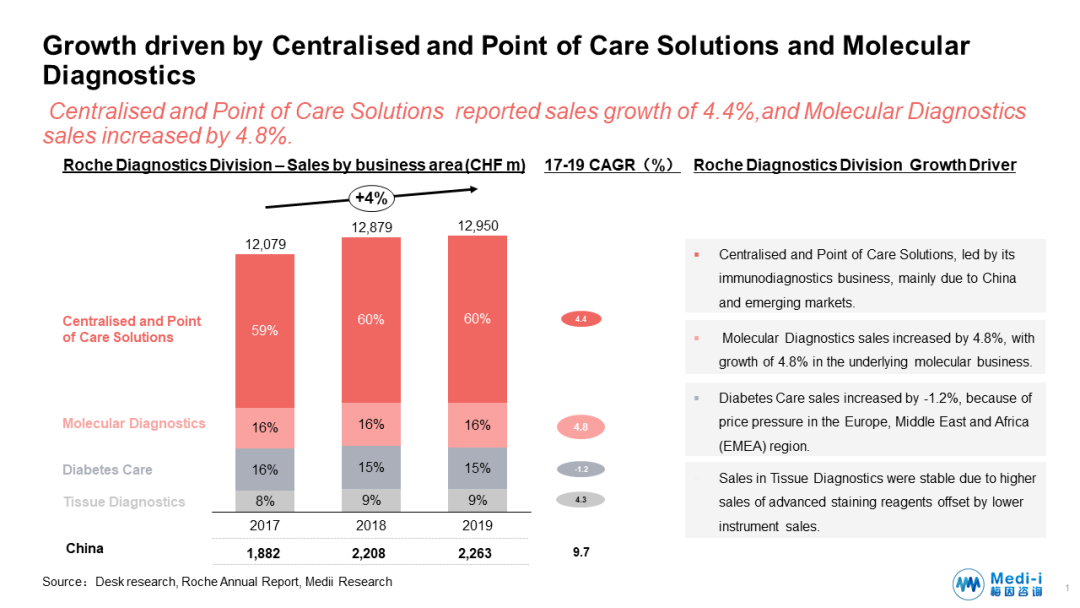 Roche diagnostics营收远高于雅培、西门子、丹纳赫等,已成为IVD市场中难以撼动的巨人,其一举一动或许均对行业影响甚远,因此了解Rochediagnostics现状及预判其未来布局显然非常必要。 Roche diagnostics将业务划分为中心实验室和POC诊断、分子诊断、糖尿病管理、组织诊断四部分。2019年Roche diagnostics全球营业收入达129.5亿瑞郎,具体分析如下: