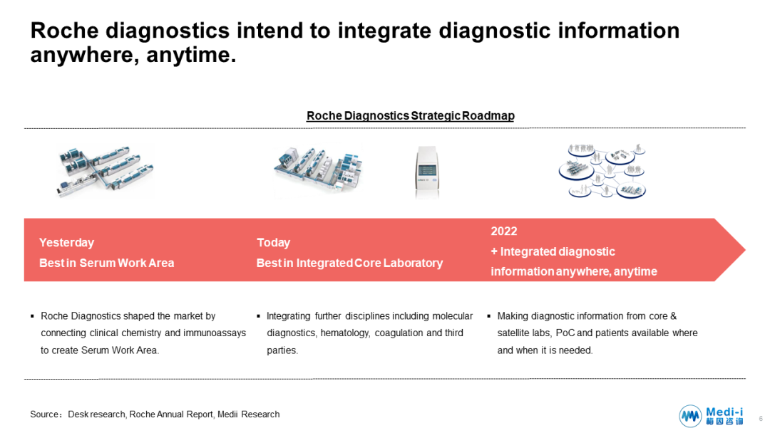 Roche diagnostics持续完善其中心实验室和POC诊断业务,迭代升级成为集试剂&分析仪、实验室自动化、实验室软件、POC产品、咨询服务及数字化于一体的综合服务商,驱动中心实验室和POC诊断业务稳步发展。 Roche diagnostics分子诊断业务向中心化和POC化均衡发展,以满足不同客户群体的需求。同时,分子诊断业务产品也从血液筛查、感染性疾病、性传播疾病逐步拓展至器官移植、肿瘤等领域。 Roche diagnostics糖尿病管理业务包括数字化管理解决方案、动态血糖监测、血糖监测以及胰岛素给药系统,但受限于欧洲、中东等地区的价格压力,其营业收入略有萎缩。 Roche diagnostics组织业务可提供基于组织病理流程的全面服务,包括样品制备、组织染色、显影及报告分析。 过去,Roche diagnostics best in临床生化、免疫诊断; 目前,Roche diagnostics best in 整合中心实验室业务; 未来,Roche diagnostics 将整合诊断信息,以期触手可及。