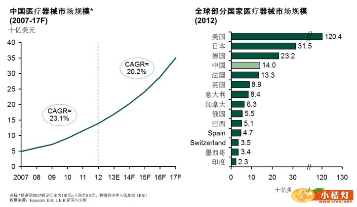 中国很快就有望成为全球第二大医疗器械市场。在规模和市场份额之外,自主创新领域也获得了越来越多的关注。国内企业在自主创新领域表现如何?又面临着什么样的阻碍?于此同时,外资的医疗器械企业在中国又在进行着什么样的创新活动呢? 和医药市场一样,中国医疗器械市场在过去一直保持着快速增长,并且被很多人认为是“后劲”更足的一块。中国市场在2012年就已经是全球第四大医疗器械市场,市场规模达到140亿美元,并且行业内大多认同还能在相当一段时间内维持20%以上的增长。按照这种趋势下去,中国很快就有望成为全球第二大医疗器械市场。