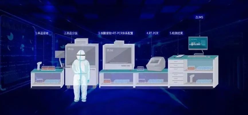 基于MGISTP-7000分杯处理系统 + MGISP系列自动化核酸提取设备 + ZLIMS自动化实验室信息管理系统的全套新冠解决方案,为当前大人群检测提供了完善的自动化解决方案,极大地缓解了检测实验室的空间压力、时间压力和人员压力。以日产5000例的方舱实验室为例,该套方案可实现占地30平米方舱即建即用,自动化程度高达80%以上,为一线抗疫提供了强有力的检测利器。