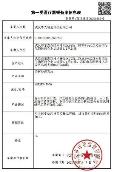 2020年8月7日,深圳华大智造科技股份有限公司(以下简称“华大智造”)最新研发的全自动MGISTP-7000分杯处理系统正式获得国家药品监督管理局NMPA一类医疗器械认证。
