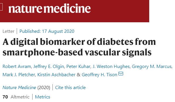 近日,加州大学旧金山分校(UC San Francisco)的研究人员已经开发出一种“数字生物标记”,可以使用智能手机的内置摄像头来检测Ⅱ型糖尿病,智能手机有可能成为一种低成本的家用替代品,取代抽血和基于临床的筛查工具。 Ⅱ型糖尿病影响着全世界超过4.5亿人,它几乎可以影响机体每一个器官系统,包括冠心病、肾衰竭、失明和中风。在目前的大流行中,它被发现还加重了COVID-19患者的症状。然而,糖尿病初期并没有什么症状,很容易被人忽视。此外,到目前为止,还缺乏检测糖尿病的无创且可扩展的工具,因此科学家们进行了这项研究。 研究人员说,使用智能手机中已经包含的技术,可以轻松使用筛查工具,提高检测糖尿病的能力,包括无法获得传统医疗护理的人群。这项研究在2020年8月17日发表在《自然医学》(Nature Medicine)上,题为“A digital biomarker of diabetes from smartphone-based vascular signals”。