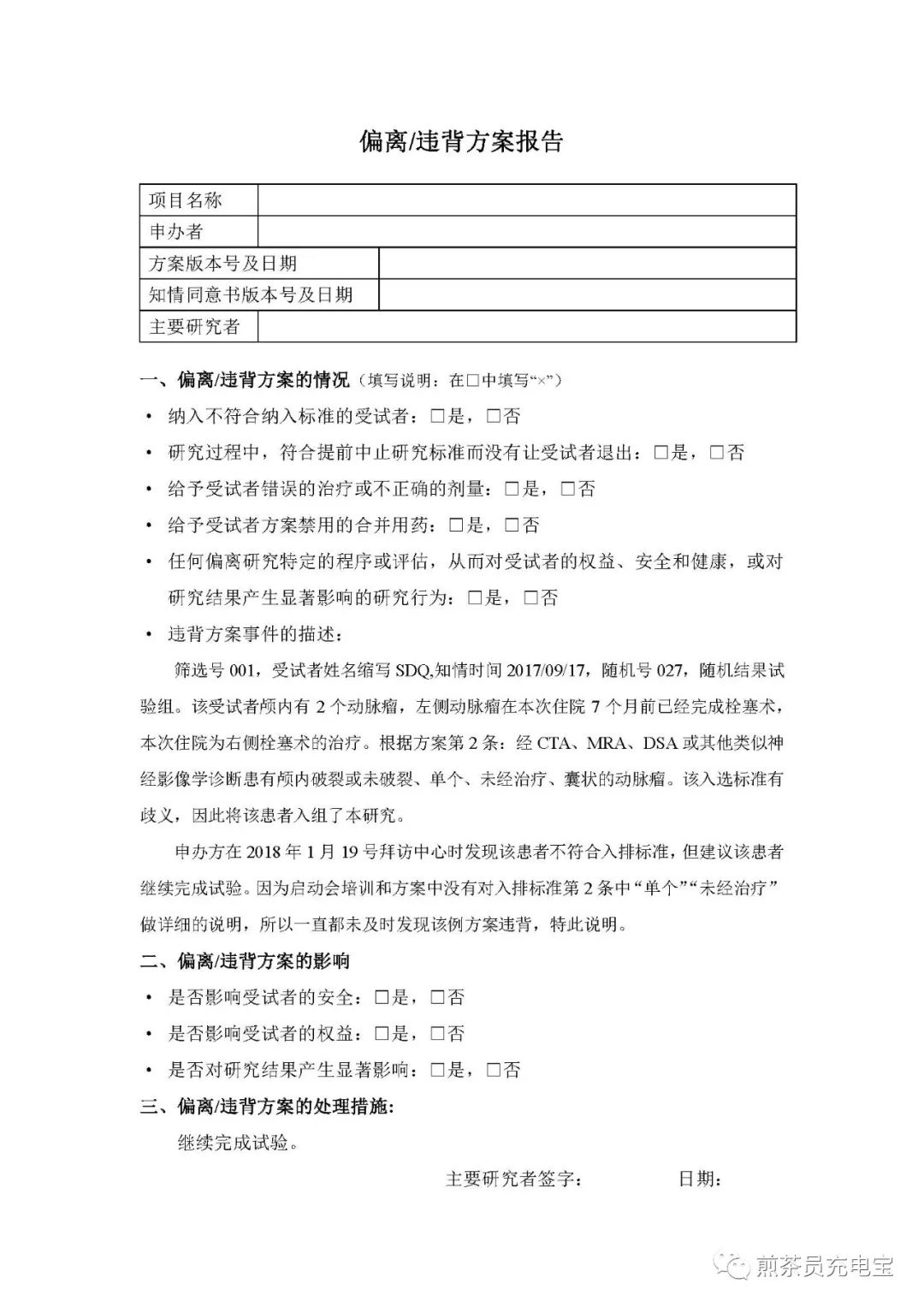 1 相关法规要求 从业多年,不断听到大家对方案违背、方案偏离二词争论不休,甚至从字义的角度解读“违背-Violation” 重于 “偏离-Deviation”,但法规的定义究竟如何呢? 方案偏离 Protocol Deviation 方案的适当修改预先得到IRB/IEC的书面批准/赞成之前,不能偏离或改变试验方案,除非有必要排除对于对象的直接危害,或方案的改变只涉及试验的后勤或管理方面(如更换监察员,改变电话号码)。 虽然药物GCP未规定何谓方案偏离,但两个法规内容无实质性差异: