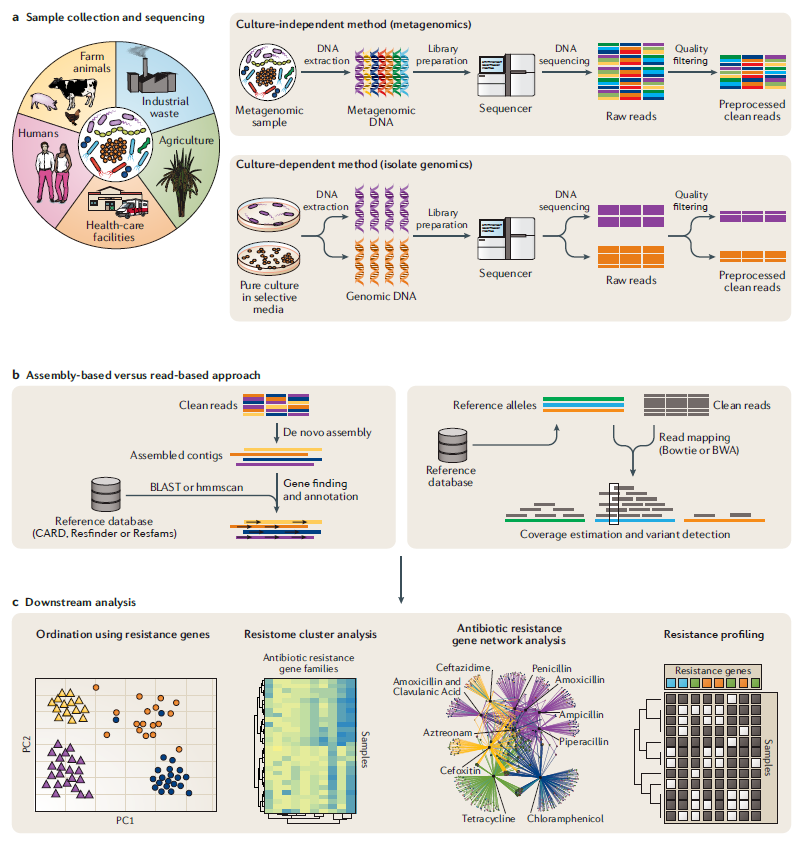 2019年3月华盛顿大学医学院的科学家们在nature review上发表研究综述sequencing-based methods and resources to study antimicrobial resistance,对使用NGS进行微生物耐药研究的方法和资源进行了详细的阐述。抗菌素是指抑制或杀灭细菌的小分子。这些小分子通常用于治疗细菌感染,但一些细菌在抗菌筛选压力下仍能生存、生长,即具有耐药性。耐药性出现是微生物固有属性,是微生态相生相克的自然结果。