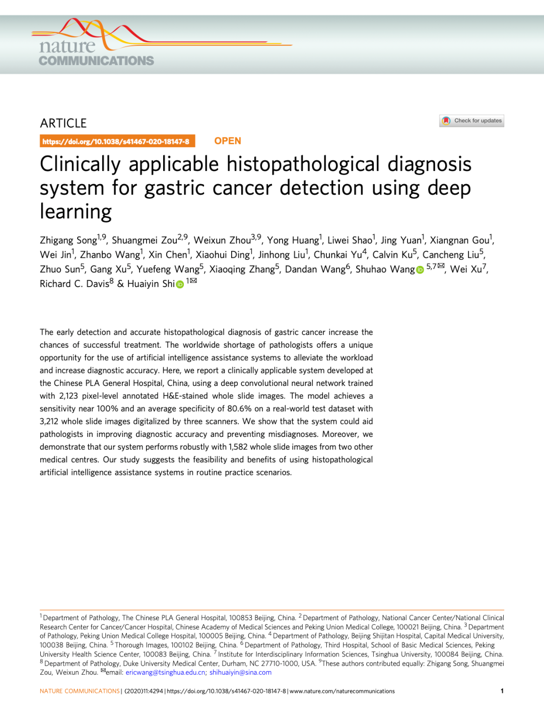 8月27日,中国解放军总医院、中国医学科学院肿瘤医院、北京协和医院联合透彻影像开展的人工智能胃癌病理辅助诊断多中心研究成果「Clinically applicable histopathological diagnosis system for gastriccancer detection using deep learning」Nature Communications发表。这是中国研究团队在病理人工智能领域发表的顶级学术成果,也是全球首个可应用于复杂器官临床病理诊断的人工智能系统。
