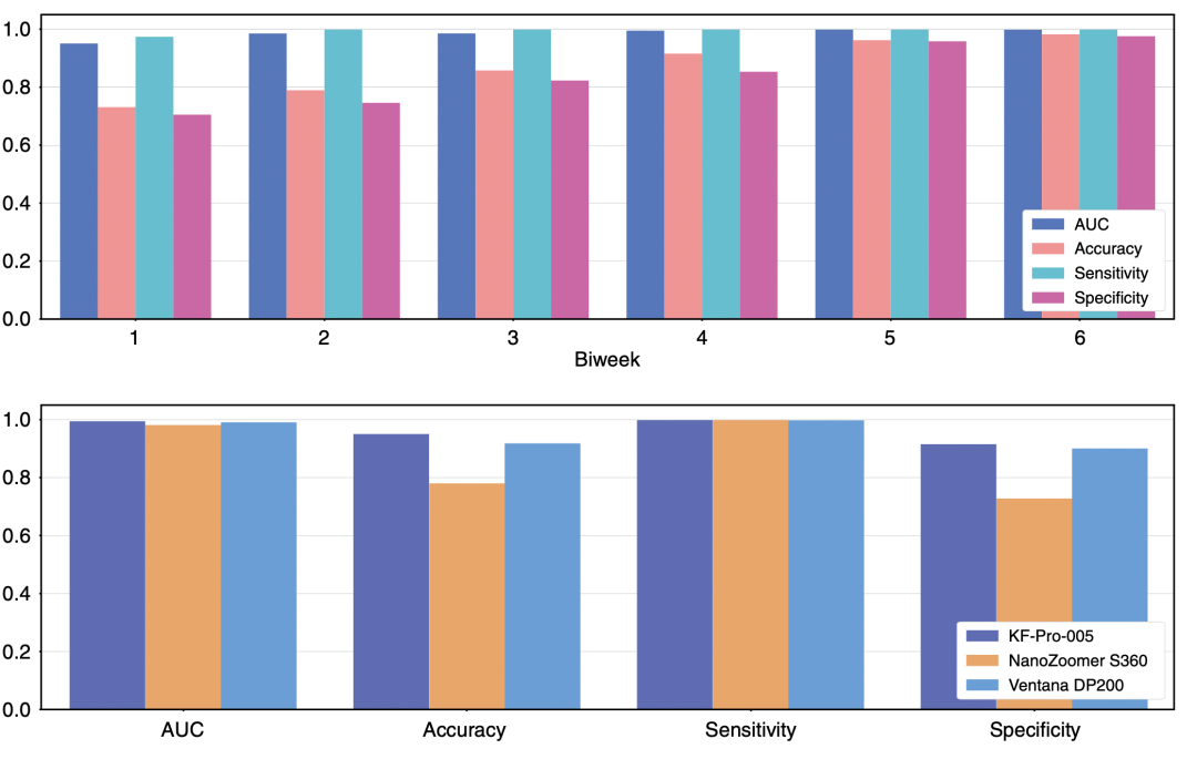 图3. 深度学习模型在解放军总医院数据上的表现,在三个月的连续样本上,模型展示出了较好的准确率,与此同时,模型在三款不同品牌的切片扫描仪上的表现较为稳定