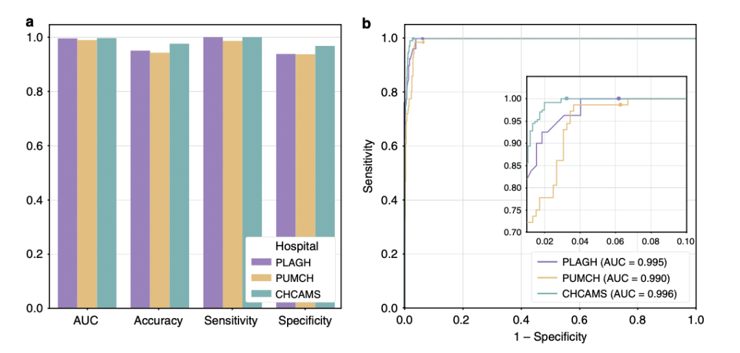 图6. 多中心测试结果,模型在医科院肿瘤医院与北京协和医院的样本上获得了接近100%的敏感度和超过90%的特异性