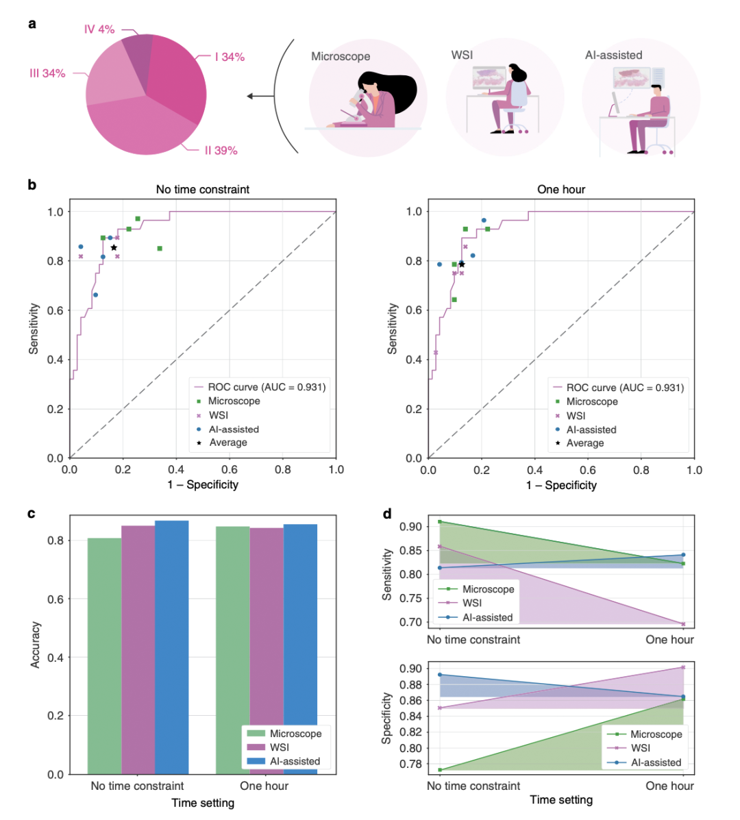 为了验证人工智能系统在临床诊断中的表现,研究团队邀请了12名初级病理医生参与了人机协同测试。12名医生被随机分为显微镜组、数字切片组与人工智能辅助组,并施加了不同强度的压力(不限制诊断时间 vs. 限制一个小时的诊断时间)。研究发现,加入时间约束后,显微镜组与数字切片组的医生均呈现出漏诊率的增加,而人工智能的辅助显著提升了医生诊断的稳定性,诊断敏感度得以保障。