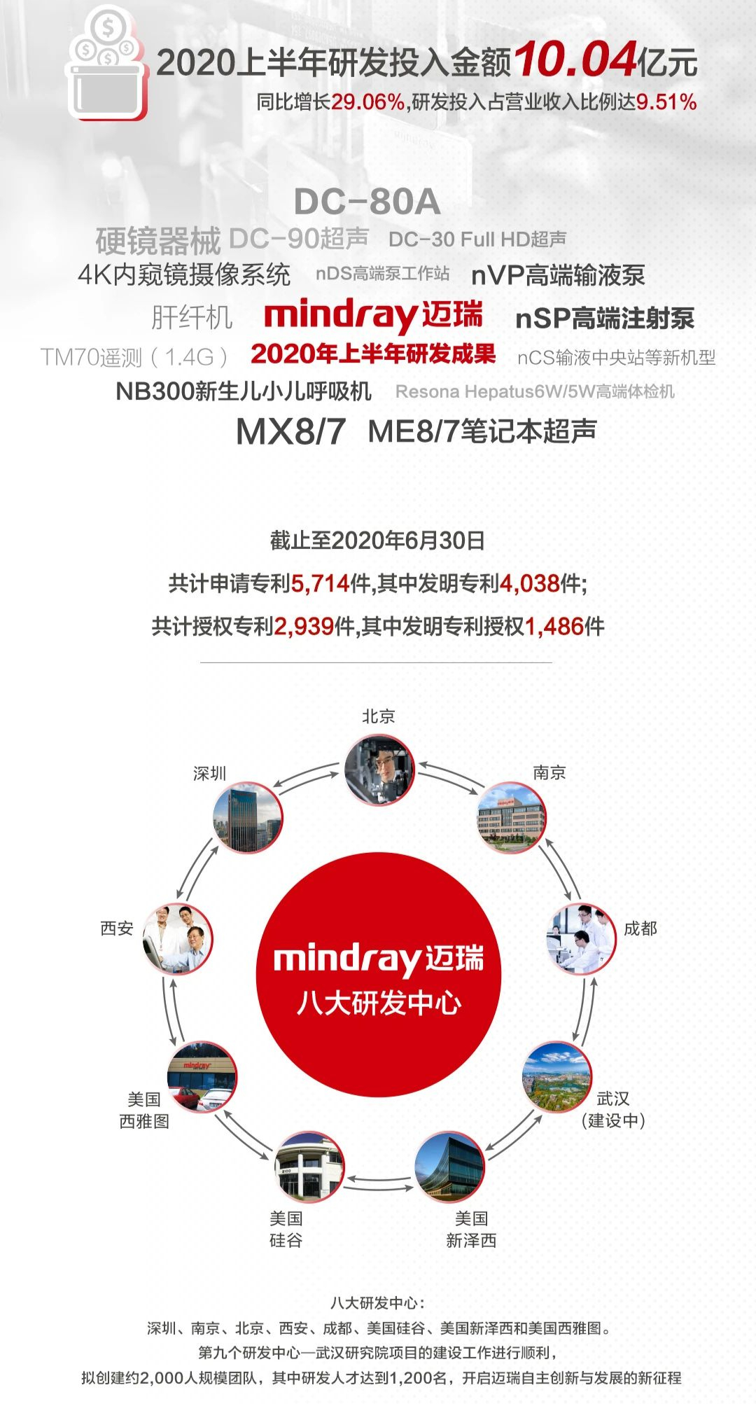 2020上半年公司整体业绩保持较快增长,主要受益于公司三大业务板块持续注重研发创新,分别在国内和国际市场进一步实现高端客户群突破。其中受新冠疫情的影响,公司生命信息与支持业务的监护仪、呼吸机、输注泵,医学影像业务的便携彩超、移动DR等和疫情直接相关的产品增长不同程度加速。其中,新冠疫情对生命信息与支持业务的拉动作用尤为显著。在生命信息与支持领域,报告期内公司实现营收53.43亿元,同比增长62.26%。作为疫情期间需求量较大的业务领域,生命信息与支持业务中的监护仪、呼吸机、输注泵以及瑞智联IT解决方案此次发挥了巨大的作用。体外诊断业务:实现收入30.30亿元,占总营收比28.68%,同比增长6.49%。常规诊断试剂销售受门诊量下滑影响有所承压,预计目前已基本恢复,上半年化学发光免疫分析仪装机量预计超过1000台,或带动试剂持续放量。Q2海外新冠抗体试剂需求大增,对冲了疫情对IVD业务的负面影响,预计下半年将持续受益于海外疫情对检测试剂的需求。医学影像业务:实现收入21.05亿元,占总营收比19.93%,同比增长6.67%。一季度彩超业务影响较大,但自3月起便携彩超和移动DR需求增加弥补了彩超销量下滑的影响,其中移动DR在国际市场品牌影响力得到提升,为开拓国际市场奠定基础。可以看到,体外诊断板块以及影像板块增长幅度并不大,疫情拉动了板块的其他产品的需求,所以使得体外诊断和医学影像业务整体只有小幅度的增加。随着国内市场的相关需求已经在逐步回归正常水平。预计后期这两大板块的业绩增长可能会相对乏力。在营收、利润保持增长的同时,迈瑞医疗在研发创新上也保持了惯有的高投入。2020年上半年,研发投入金额达到10.04亿元,同比增长29.06%。据了解,迈瑞已建立起基于全球资源配置的研发创新平台,设有八大研发中心,共有约2,500名研发工程师,分布在深圳、南京、北京、西安、成都、美国硅谷、美国新泽西和美国西雅图。报告期内,迈瑞的第九个研发中心——武汉研究院项目的建设工作进行顺利,拟成为迈瑞医疗的标杆研究院。公告显示,截至2020年6月30日,公司共计申请专利5,714件,其中发明专利4,038件;共计授权专利2,939件,其中发明专利授权1,486件。2020年上半年,迈瑞的ePM系列监护仪系统、MX系列高端便携超声系统及推车和HyLED X9手术灯均获得Red Dot和iF双项设计大奖;BeneHeart C系列自动体外除颤器获得Red Dot设计大奖。此外,公司研发与生产始终保持密切协同,以产品生命周期管理流程为核心,在导入新产品的研发过 程中,充分考虑生产的便捷性,优化产品设计,以提升生产效率和产品质量。公司不断加强制造能力的建 设与生产管理水平的提升,通过垂直整合、精益生产、智能制造等措施,建立健全先进的质量管理体系、 精益生产体系与智能制造体系。迈瑞凭借完善的生产管理体系,公司产品得到下游客户的广泛认可。 截至2020年6月30日,公司营销人员近3,300人。公司在国内超过30个省市自治区均设有分公司;在境 外超过30个国家拥有子公司,产品远销190多个国家及地区。公司已成为美国、英国、德国、法国等国家 的领先医疗机构的长期合作伙伴。报告期内,公司加大线上推广力度,持续优化销售渠道,提升经销商质 量,加强销售团队管理,完善销售和服务体系,提高运营效率,取得了良好的效果。 持续突破海内外高端客户群迈瑞表示,由于疫情影响而带来的需求量增加,公司的呼吸机、监护仪等抗疫设备大量进入了海内外全新高端客户群,大大缩短了公司品牌和产品的推广周期,通过产品核心竞争力的持续提升和本地化服务团队的日益完善,未来有望协同带动三大业务领域中的其他产品全面入院,提升公司整体产品在高端客户群的渗透率。在国内市场方面,迈瑞的产品持续被国内一流医疗机构接受,销售的产品已全面覆盖生命信息与支持、体外诊断、医学影像三大业务领域,同时实现从中低端到中高端、从科室到全院的整体化、集成化解决方案,特别在疫情后的补短板、医院改扩建以及战略储备项目中具备更大竞争优势。在国际市场方面,受益于过去的长期市场耕耘和品牌建设,迈瑞在疫情中凭借优质的质量和完善的服务,获取了大量的订单,加快了各国公立市场及高端客户群的突破。公司呼吸机及监护仪产品大范围进入海外高端医院,提升了客户层级,加强了客户关系,树立了可信赖、高质量的全球品牌形象,为后续持续的客户群突破打下了坚实的基础。2020年上半年,迈瑞医疗境外收入占比47.45%。在全球经济面临风险、政府财政压力加剧的背景下,迈瑞在三大核心业务之外,公司也在积极布局新兴板块,或成为未来新的业绩增长点。目前已经把目光瞄准微创手术器械市场。迈瑞医疗发布公告称,迈瑞医疗全球第二总部已在武汉开建,预计武汉生产基地项目及武汉研究院项目的总投资额不超过人民币45亿元,前者总投资额预计20亿元,后者总投资额预计不超过25亿元。值得注意的是,迈瑞医疗武汉生产基地项目建设内容包括骨科植入物及手术治疗设备制造、检验试剂制造、生物原材料制备、微创手术设备制造等。而微创手术器械被称为“毛利率超80%”的市场。相关资料也显示,到2024年,中国每百万人口接受微创外科手术的数量及微创外科手术的渗透率将分别增至18,242台及49.0%。迈瑞此举无疑会更加稳固自己“大哥大”