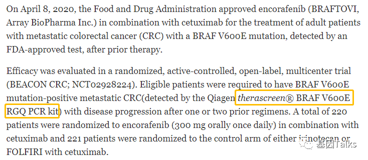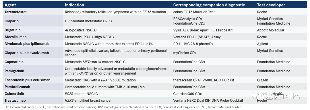 随着肿瘤精准医疗的快速发展,多种肿瘤靶向药物和生物标志物相继被开发,许多生物标志物正在不断向伴随诊断体外试剂的方向拓展,肿瘤靶向治疗及其伴随诊断产业必将蓬勃发展。 精准医疗在肿瘤领域的发展迅速,伴随诊断(Companion Diagnostics,CDx)体外试剂在临床亦被广泛采用,并越来越多地用于指导临床治疗决策,使临床医生能够更好、更精确地指导患者接受最适合其独特基因组特征的靶向治疗(Targeted Therapies,TTs)。 比如,EGFR突变的NSCLC患者能够从EGFR-TKI药物中获益,无EGFR突变的患者则不能获益,这就是预测生物标志物。伴随诊断的用途就是检测这些生物标志物,通过比较生物标志物阳性和阴性群体患者的药物效果来支持生物标志物与药效预测的最大相关性。 FDA接受伴随诊断的记录可以追溯到1998年,当时丹麦Dako公司的免疫组织化学法(IHC)产品 DAKO HercepTest 被开发用于检测乳腺癌组织中的HER2蛋白表达,并与曲妥珠单抗(Herceptin,赫赛汀)同时获得批准。 截至目前,FDA已经批准43款伴随诊断产品,包括Guardant360 CDx。1 伴随诊断试剂对采集自肿瘤患者的样本进行检测,其结果可以为患者使用抗肿瘤药物的安全性和有效性提供重要的信息,包括: ❐ 确定最有可能从特定治疗药物中受益的患者; ❐ 确定该药物相关严重不良反应风险增加的患者; ❐ 监控药物治疗反应,以便调整治疗并提高安全性或有效性。2 2020年,肿瘤靶向(免疫)治疗及其伴随诊断试剂的批准率同步发展,进一步扩大了伴随诊断的“弹药库”。自2020年1月以来,FDA已批准10种新的单药/联合用药方案及其伴随诊断产品 + 2种已上市药物的新伴随诊断产品,包括首个基于NGS的液体活检伴随诊断产品 Guardant360 CDx,具有重要的里程碑式意义: ① BRAF V600E突变 同时,FDA还批准 Qiagen 的 therascreen BRAF V600E RGQ PCR Kit 作为其伴随诊断产品(FFPE组织检测)。3 ② FGFR2融合或其他重排