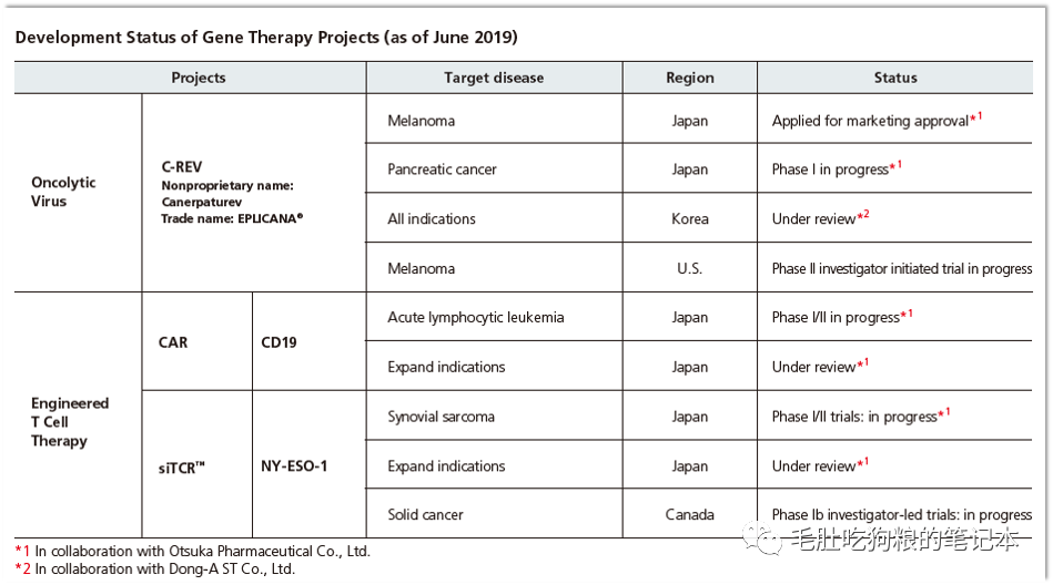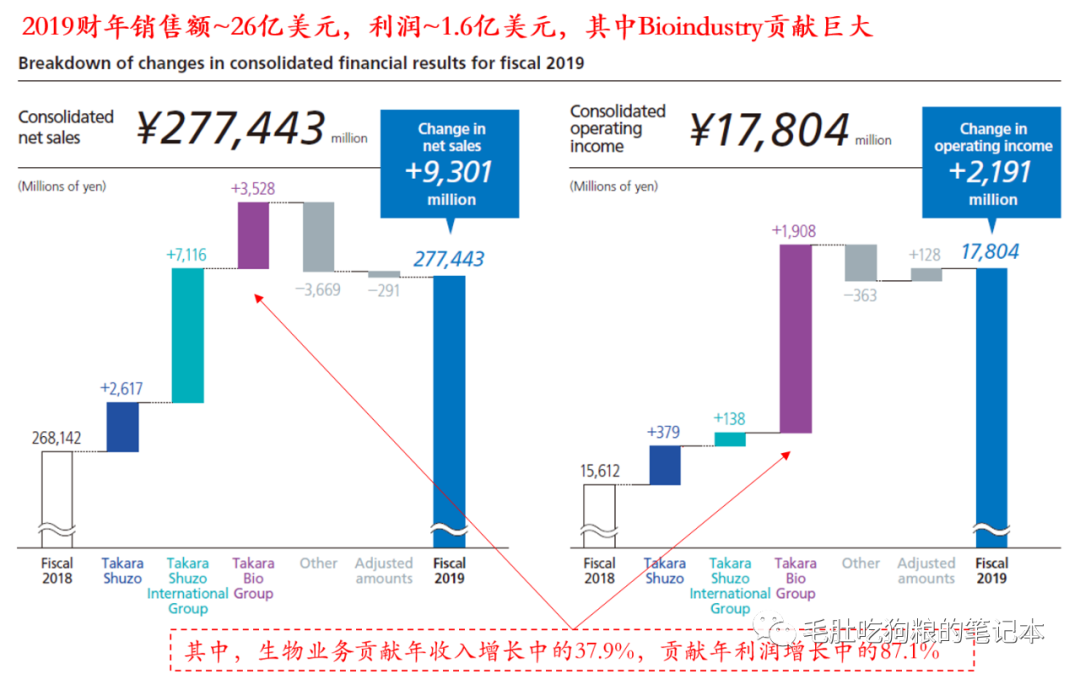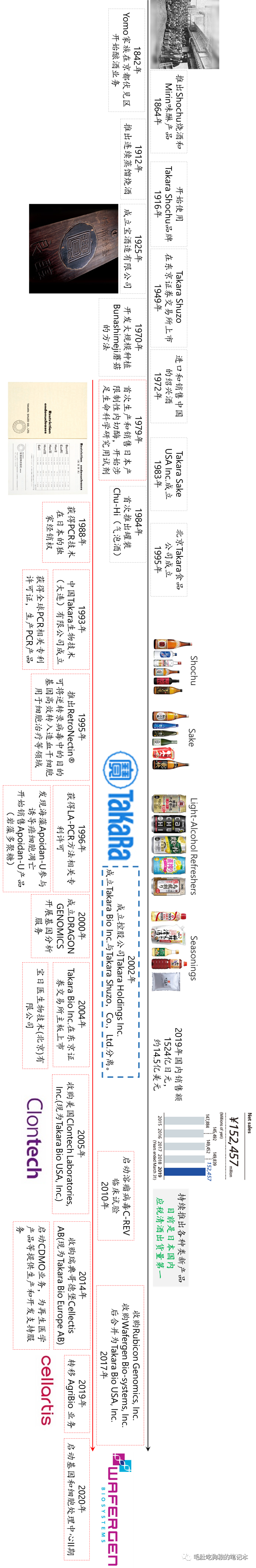 “百年老店”系列之:TaKaRa简介 Takara是一家总部位于日本京都的生物医药企业,起源于1841年,正式创立于1925年。该公司主要从事酒精饮料、调味品、研究试剂、科学仪器、保健食品以及基因和细胞治疗产品(CDMO)的研发和销售。 母公司Takara Holdings在东京证券交易所上市,目前市值1934亿日元,约18.3亿美元;员工4500人,其中海外2200人。 对于生命科学工作者来说,Takara应该不陌生,其提供的限制性内切酶和聚合酶是实验室中常用试剂。Takara也是世界上首批提供生命科学科研用试剂以及商用PCR仪器和试剂的企业。 企业 Philosophy:We will create new value to make people smile. 依照惯例,先上才艺(diachrony): 从以上将近两百年的成长轨迹中可以看出,Takara是起源于传统发酵技术,壮大于酒类业务,发展于生物技术产品,目前扎根于新兴CDMO市场。 Takara目前的业务构成如下,总体分为4个板块。第一是针对日本国内市场的酒精饮料、调味料和酒精的制造和销售;第二是针对日本以外地区的酒类等业务的管理和销售;第三是生物医学类业务,包括研究用试剂、科学仪器等的生产、销售;CDMO;基因和细胞治疗的商业化;第四是针对日本国内的其他业务,包括印刷等。 根据Takara 2019年年报,企业的营收如下: 四个业务板块的营收和贡献情况如下: 不难看出Biotech业务增长强劲,具体数据如下:临床基因与细胞治疗进展: 2008年,Takara Bio启动了日本第一个基因治疗的临床试验,之后还推进了多个基因治疗项目。目前正在进行针对黑色素瘤和胰腺癌的溶瘤病毒Canerpaturev (C-REV)的临床试验,并于2019年3月提交了C-REV作为黑色素瘤治疗药品的生产和销售审批申请。 持续凝练核心业务,适配最佳变现方向,保持快速增长态势 |