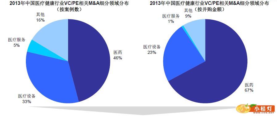 健康产业是当下的一个朝阳产业,已同TMT已成为PE/VC投资最为活跃的两个领域。根据清科研究中心统计数据显示,2013年VC/PE共投资了210家医疗健康企业,为2008年以来最高。投资金额总计19.9亿美元,仅低于“全民PE”火热的2011年。2013年医药投资涉及企业大概80多家,医疗设备50多家,医疗服务是29家,其他有12家。其中,医疗服务的投资是呈现快速增长,2013年已经有29家医疗服务企业获得融资。