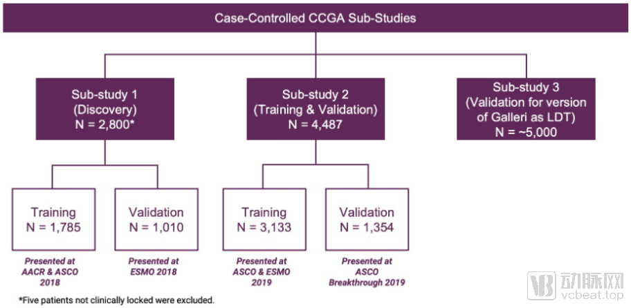 这是GRAIL正式开展的第一项研究计划,分为三个不同的子研究进行。三个子研究呈递进关系,CCGA-1主要致力于发现与肿瘤直接相关的可检测靶点;CCGA-2则扩大队列,深入到算法的训练和验证中;而现在正在开展的CCGA-3,则是对前两个阶段的成果,也就是最终呈现出的产品,进行更进一步的临床验证。