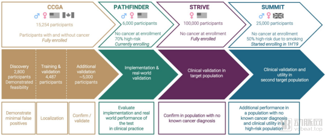 在CCGA之后,GRAIL又接连开展了STRIVE、SUMMIT和PATHFINDER三项前瞻性临床研究,从健康受试者的中出发,通过长期的跟踪随访,进一步验证自己的产品算法。