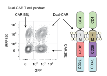 9. 双 CAR-T 细胞体外效应功能强过单一的 4-1BB 共刺激 CAR-T 细胞。 研究发现,双 CAR 和 CD28 共刺激的 CAR-T 细胞以相似的方式聚集在一起,CD4 + 的 CAR-T 细胞表达更多的 TNF 和 IL-2,CD8 + 的 CAR-T 细胞上调更多的 CD107a 和 MIP-1β效应分子。相反,CD4 + 和 CD8+4-1BB 共刺激的 CAR T 细胞聚集在一起,并显示出减弱的效应分子水平。这些试验结果显示,双 CAR-T 细胞分别利用抗原驱动的增殖和 4-1BB 和 CD28 共刺激域介导的效应器功能来提高效力。