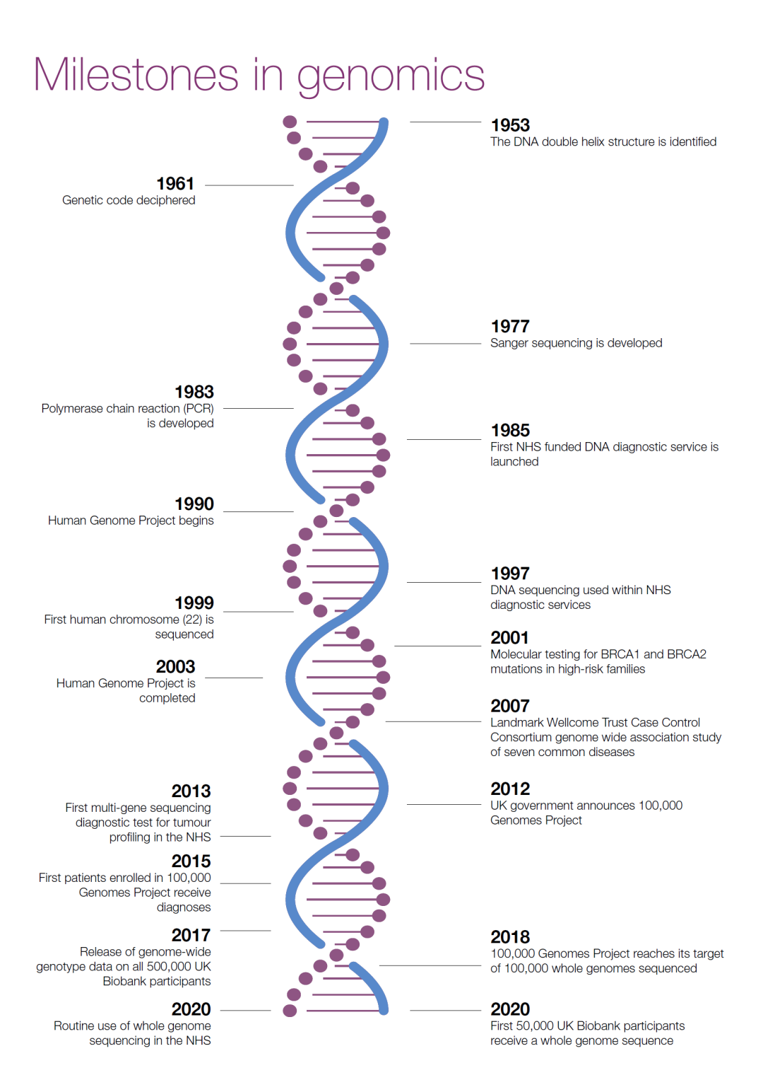 1953年,沃森和克里克发现了DNA双螺旋结构,自此开启了分子生物学时代。在此后的几十年里,分子遗传学、分子免疫学、细胞生物学等新学科如雨后春笋般出现,到今天,生命科学已成为最热门的学科之一,21世纪更是被称为“生命科学的世纪”。 △沃森和克里克发现了DNA双螺旋结构 这几十年来,英国一直走在基因组学的前沿,将基因组学的临床影响、研究和创新放在首位。2019年,《保守党宣言一》中更是承诺,将投资研究世界级的计算和健康数据系统,使英国成为全球领先的生命科学中心。 英国对基因组学的持续资助和关注,形成了一个多元化、互补的项目生态系统,这些项目汇集了英国在科学、研究和技术方面的主要优势。 近日,英国政府颁布了全国性基因组学医疗保健战略——《基因组英国(Genome UK)》。此战略被誉为“医疗的未来”,具有里程碑意义。 △基因组学里程碑 来源:《Genome UK》 其前沿性在哪?亮点又在哪? 在医疗水平迅速发展的今天,我们逐渐明白“预防大于治疗”的意义,而《基因组英国(Genome UK)》的战略目标,就是旨在通过基因组测序为患者提供最好的预测、预防和个性化医疗。 在接下来的十年里,英国将建立世界上最先进的基因组医疗系统,以最新的科学进展为基础,以较低的成本提供更好的健康结果。通过减少临床护理和研究之间的界限,做到早期发现和快速诊断,利用基因组学对特定患者群体进行干预,以应对新的全球性流行病和公共卫生威胁。 为了实现这一战略目标,英国承诺到2025年,公共研发支出增加至220亿英镑,使英国成为世界领先的学术和科学基地。 该战略在生命科学领域具有前沿性,对未来医疗具有里程碑意义,重点主要集中在三个关键领域和五个交叉主题: 将基因组学技术纳入国民医疗保健系统(NHS),以改进疾病的诊断、分层和治疗为患者提供最有效的药物治疗建议,包括为患者提供定制化的药物治疗。 此前,英国国家医疗服务局(NHS England Genomics Medicine Service)承诺为50万人做全基因组测序(WGS),后续他们将继续执行这一计划。 针对癌症,英国计划引入多学科,利用一系列基因组学、影像学和纵向医疗保健数据来改善患者的预后。 将通过预测性和预防性保健改善公共卫生和健康,其中包括扩大新生儿筛查范围,以及高危人群的全国性筛查项目。 支持基础研究和转化研究,并确保研究和医疗服务之间的无缝接口,重点关注数据的创新、数据的合理使用以及数据的多样性和公平性。 (1)参与公众、患者和医护人员的对话; (2)通过培训、教育以及建立医疗保健新标准参与跟基因组学相关的医疗保健事务; (3)通过共同的标准、资金、采购和研发结构,支持英国英国基因组学产业发展; (4)通过强有力的道德框架、数据安全、强大的技术基础设施和法规来维护公众的信任。 (5)在全国协调数据分析资源,使医疗保健专业人员和经批准的研究人员能够方便地访问、解读基因组数据集。 |
