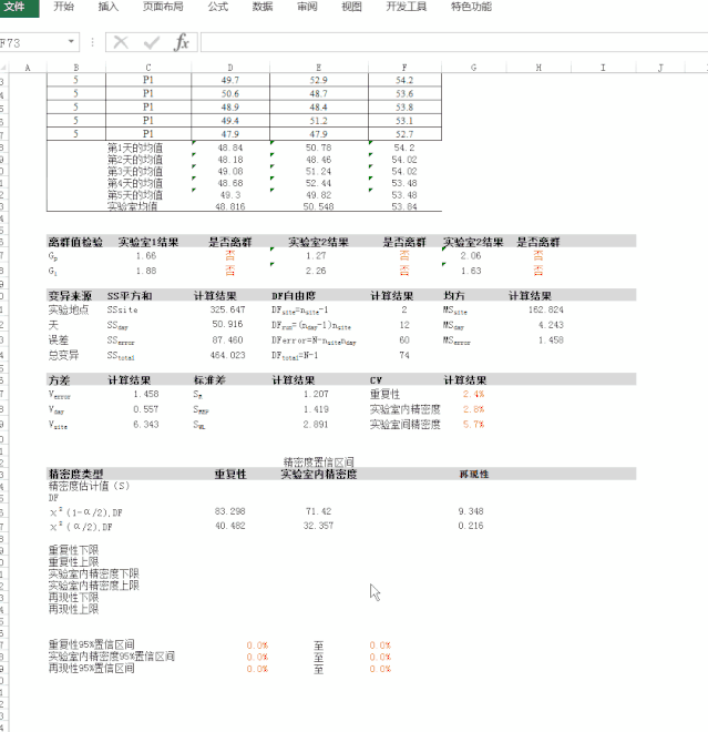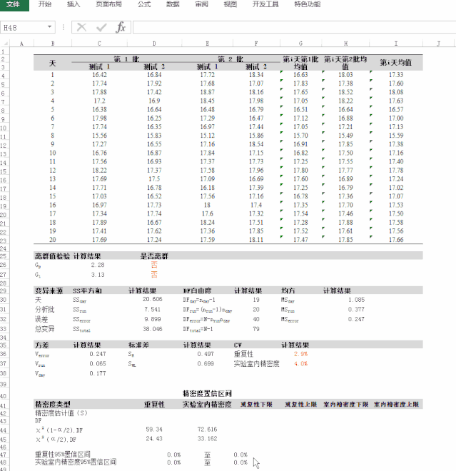3.5计算95%置信区间计算各类精密度类型对应的有效自由度;查表得到期望置信水平和有效自由度下的卡方值;根据公式求得标准差的95%置信区间;标准差的95%置信区间除于平均值为CV的95%置信区间 (对于制造商,计算95%置信区间的重点是了解产品最好和最差的分析性能水平) ① 实验室内精密度95%置信区间的excel统计 ② 实验室间精密度95%置信区间的excel统计