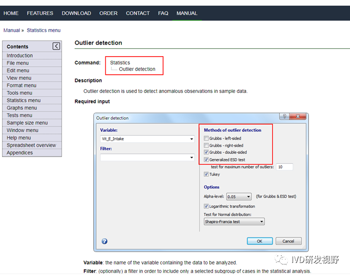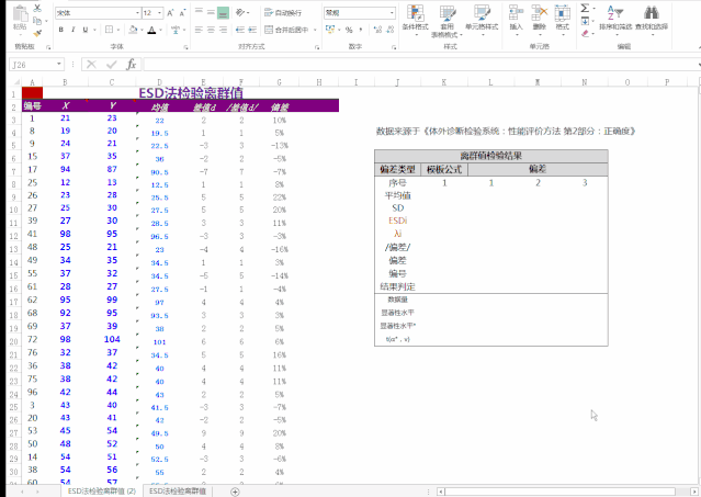 1.前言 上一篇《IVD分析性能评估系列2—正确度》文章主要展示了使用excel计算两种检测系统回归系数和医学决定水平偏倚的方法,由于篇幅有限, EP9-A3和《体外诊断检验系统性能评价方法第 2 部分:正确度》中的离群检验未详述。本文主要展示使用excel进行ESD法检验离群值的操作。2.ESD检验ESD检验是一个检测离群值的方法,它检验服从近似正态分布的一个单变量数据集中的一个或多个离群值。首先假定存在离群点,离群点的概率不能超过5%,根据离群概率和样本总数设置潜在的离群点上限,向下取整数作为离群数。如样本总数为75例,则离群点上限=75*5%=3.75,离群上限数为3例。离群上限数3时执行3次单独的检验:检验第1个可能的离群值,计算相应的统计量,在给定的显著水平α下做出判断;去除第1个可能的离群值后,检验第2个可能的离群值,计算相应的统计量,在给定的显著水平α下做出判断;去除第1、2个可能的离群值后,检验第3个可能的离群值,计算相应的统计量,在给定的显著水平α下做出判断。ESDi为最大偏倚绝对值与标准差的比值,ESDi大于λ临界点时,认为该观察值为离群值。3. Medcal计算ESD统计量