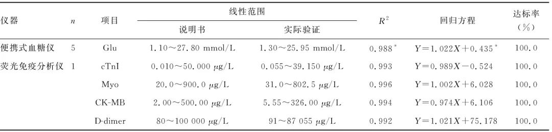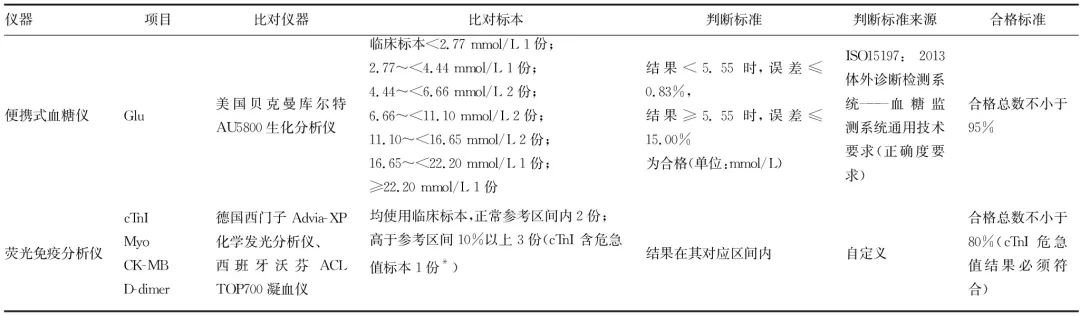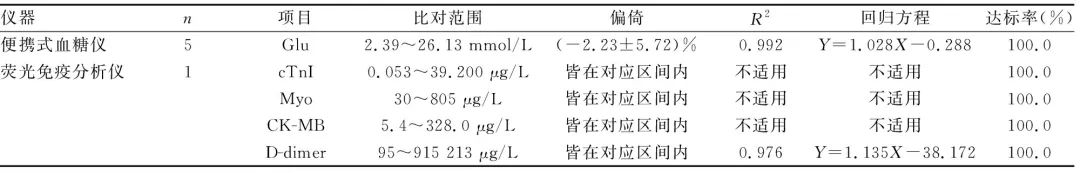 来源:《检验医学与临床》2020年17期、CACLP体外诊断资讯作者:段小勇1,王 晟2△,吴柳春3 三峡大学第三临床医学院/国药葛洲坝中心医院:1.急诊科;2.检验科;3.医疗业务部,湖北宜昌 443002 急诊医学的特点是要以最快的速度、最有效的手段,尽最大可能挽救患者的生命和最大限度地减轻患者的伤残[1],因此需要一种能就地取材、即时报告的检验方法为最终治疗的成功赢取充足时间。而即时检测(POCT)就是一种能够在最接近患者的地点完成标本采集[1]并即刻进行的检测分析,可快速得到检验结果,为患者即时监测或者诊疗提供必要依据[2]的检测模式,能够帮助急诊科医生短时间内得到关于诊断及预后的检测结果[3],有助于疾病的治疗[4]。为确保急诊患者的成功救治同时配合胸痛中心的建设,经本院POCT管理小组的调查研究后决定在急诊科开展包括血糖(Glu)、心肌梗死3项联合检测(以下简称心梗三联)[肌钙蛋白Ⅰ(cTnI)、肌红蛋白(Myo)、肌酸激酶同工酶(CK-MB)]、D-二聚体(D-dimer)的POCT项目检测并进行全面质量管理。现报道如下。 1 资料与方法1.1 一般资料 选取 2018年11月至2019年5月在本院急诊科进行POCT检测的患者1 785例为观察组,其中男916例,女869例;年龄9~95岁,平均(69.2±13.6)岁;Glu检测1 383例,含危急值结果38例;心梗三联检测289例,含危急值结果17例;D-dimer检测113例。选取2018年11月至2019年5月在本院检验科进行上述急诊检验的患者1 821例为对照组,其中男972例,女849例;年龄2~97岁,平均(68.5±14.1)岁;Glu检测1 064例,含危急值结果49例;心梗三联检测536例,含危急值结果34例;D-dimer检测221例。 1.2 仪器与试剂 急诊科在用POCT仪器总计6台,其中美国雅培越佳型便携式血糖仪(以下简称血糖仪)5台,北京乐普乐锐荧光免疫定量分析仪(以下简称荧光免疫分析仪)1台(检测cTnI、Myo、CK-MB、D-dimer)。检验科使用相对应检验仪器为美国贝克曼库尔特AU5800生化分析仪,德国西门子Advia-XP化学发光分析仪和西班牙沃芬ACL TOP700凝血仪,以上仪器均使用原厂试剂及校准品。 1.3 方法 1.3.1 实施准入制和档案化管理 投入急诊科使用的POCT设备及检测项目必须通过精密度、正确度和线性范围的性能验证并由本院检验科出具性能验证合格报告;POCT设备由设备科统一编号并建档管理。使用的血糖仪和荧光免疫分析仪均为全院统一型号,以保证检测结果在院内有良好的可比性。 1.3.2 精密度验证 急诊科开展的POCT项目,每项至少使用2份不同水平的质控品,连续检测20次,计算有效检测结果 以内)的s和变异系数(CV)。1.3.3 线性验证 对精密度验证已通过的各POCT项目进行线性范围评价,包括cTnI、Myo、CK-MB、D-dimer、Glu。选取满足上述项目说明书中线性范围的高值和低值临床血浆标本(Glu标本为同血型全血各1份)。依照卫生行业标准WS/T 408-2012线性评价指南中的方法将该高值和低值标本分别按4∶0、3∶1、2∶2、1∶3、0∶4的比例配制成5个不同水平的标本,每个水平标本重复测试2次,将各水平两个检测结果的平均值作为实测值,同一项目线性验证的所有测试必须30 min内完成。依据各标本不同的稀释比例计算出其理论值和预期值,再将两者进行回归分析与线性检验,若线性回归方程的相关系数r≥0.975或R2≥0.95,则认为该项目在验证中选取的低值至高值范围内线性评价通过验证。 1.3.4 正确度验证 即比对试验,每半年开展1次POCT检测项目与大型检验仪器检测结果的比对。具体方案和判断标准见表1。 表1 比对试验方案和判断标准 注:*本院cTnI危急值范围为>0.5 μg/L。 1.3.5 制订标准操作流程 内容涵盖检测前、中、后的全部过程[5]。(1)检测前包括仪器及加样工具的使用条件和清洁要求、试剂及耗材的储存和使用、标本的正确采集、科内交接的标准流程等。(2)检测中包括室内质控的频率(每24 h必须进行1次室内质控检测并记录在案)和要求[各项的质控靶值均使用累计该项目3~5个月在控数据汇集的所有数据计算的累积平均数;质控规则仅设1~3s(控制限)失控规则,其中Glu的控制限同该项目比对试验合格判断标准;D-dimer的控制限为其质控靶值±25%数值区间;cTnI、Myo和CK-MB的控制限为其质控靶值±30%数值区间]、标准的加样方式(要求加样工具定期校准)、规范的项目检测操作流程、复检规则(与临床表现不相符时必须使用另一检测系统进行复检)和危急值登记等。(3)检测后包括检测报告的内容和形式、保存方式与期限、检测完成标本及其他医疗废弃物的处置等,并指定专人负责仪器与加样工具的维护保养和质控[6]。 1.3.6 定期评价 (1)配合医疗业务部进行每月1次的操作规范与室内质控检查,规范操作各项日常操作;(2)参加每半年1次POCT检测项目的比对试验,如发现不达标仪器立即淘汰更新。 1.4 实际应用效果评估指标 1.4.1 标本周转时间(TAT) 从医生申请检验项目到收到检验报告的时间[7]。 1.4.2 复检准确率 发现检测结果(Glu除外)与病情不符再次复检时,复检结果相同标本数占复检标本数的比例[8]。复检时使用相同标本在另一个检测系统上复测。 1.4.3 危急值抢救成功率[9] 指患者危急值状态解除(判断标准:Glu为不超过1 h的再次检测结果不在危急值区间,cTnI为血流恢复)例数与发生危急值例数之比。 1.5 统计学处理 采用SPSS22.0统计软件对数据进行统计分析,计量资料以 表示,组间比较采用t检验,计数资料以频数或百分率表示,组间比较采用χ2检验,P<0.05为差异有统计学