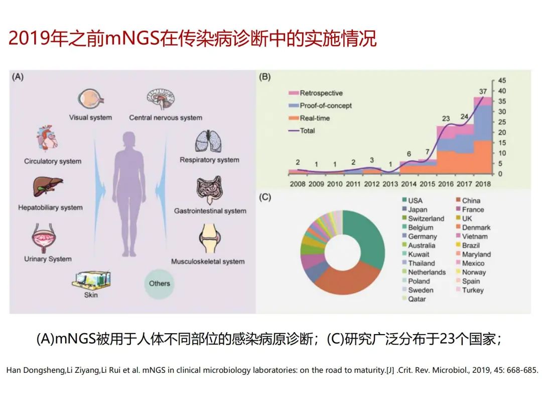 临床病原学检测的方法,传统方法包括涂片、显微镜检、血清学、传统培养的方法。对于阳性的培养物,我们可以用MALDI-TOF MS进行菌种鉴定。 最近几年发展较快的是分子生物学检测方法,包括传统PCR、多重PCR、快速PCR等。最重要的发展包括宏基因组测序(metagenomic Next Generation Sequencing,mNGS)技术的应用,经过近几年医务人员、测序公司以及科研机构大力推荐和研发后,已慢慢走入临床工作。