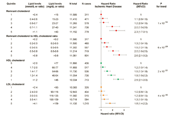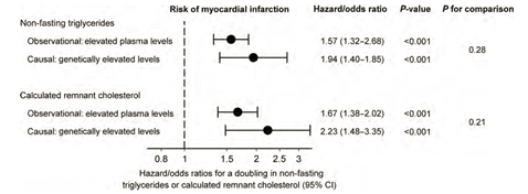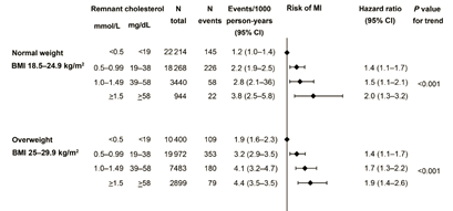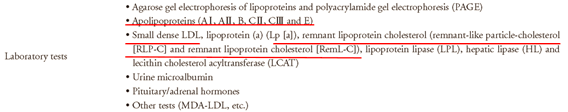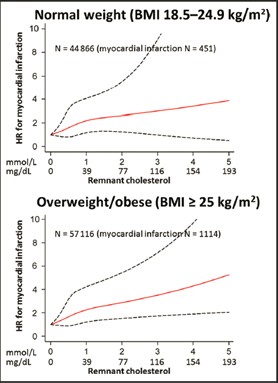 图1 美国临床内分泌医师协会(AACE)《血脂异常管理和预防心血管疾病指南》 图2 日本动脉粥样硬化学会(JAS)《预防动脉粥样硬化性心血管疾病指南》 图3 RLP-C致动脉粥样硬化机制 1.RLP-C是冠心病显著独立风险因素,可预测心血管事件 MASUOKA等[14]的研究结果显示,TG水平正常的冠心病患者血清RLP-C水平与冠状动脉狭窄显著相关(P=0.021)。NAKADA等[15]的研究结果显示,冠心病患者血清RLP-C水平明显升高,且独立于TG水平。因此,RLP-C水平成为了冠心病新的独立危险因素。 美国弗雷明汉心脏研究表明:>3000名参与者证明了残余胆固醇可以诊断和预测冠心病事件[16];Hironobu等[17]的研究结果表明,RLP-C水平升高是冠心病(CAD)的显著独立危险因素,可用于预测CAD事件和2型糖尿病患者未来心血管事件风险,如图4;Anette等[18]的研究结果显示:10万名参与者中非空腹RLP-C浓度逐步升高与全因死亡风险增加相关,而LDL-C不相关。 图4 RLP-C用于预测CAD事件和2型糖尿病患者未来心血管事件风险 2.RLP-C水平上升是心肌梗塞的危险因素 哥本哈根市心脏研究与哥本哈根缺血性心脏病研究证明:非空腹甘油三酯或计算出的残留胆固醇增加一倍的观察风险估计值,且RLP-C优于TG[12],如图5。 3.RLP-C水平升高是缺血性心脏病的危险因素 Jepsen A K等[19]的研究证明:RLP-C的增加是缺血性心脏病患者危险因素之一 ,且RLP-C的增加与低度炎症有因果关系,而LDL-C的增加无关炎症反应,如图6。 图6 RLP-C的增加是缺血性心脏病患者危险因素 4.检测RLP-C在肥胖人群中也适用 哥本哈根研究(10万人)[4]证明:RLP-C水平与BMI呈正相关,如图7;且RLP-C水平升高与正常体重,超重和肥胖的人群心肌梗塞风险升高均相关,如图8。致病机制为RLP-C在血管壁富集,导至动脉粥样硬化。 图7 RLP-C水平与BMI呈正相关 图8 RLP-C水平升高与正常体重,超重和肥胖的人群心肌梗塞风险升高均相关 除此之外,还有日本学者Matsuo N等[20]研究证明,RLP-C水平与斑块坏死程度正相关;与斑块纤维化负相关,是一个可用于评估斑块稳定性的新型指标,帮助临床预测心血管事件风险。 日益增多的证据表明RLP-C的升高是CAD和全因死亡率的危险因素,因此CAD的防治不仅要以LDL-C为主要目标,同时也需注意对非空腹RLP-C水平的控制。但仍需大型随机临床干预试验证明降低RLP-C浓度是否可相应地降低冠心病风险,同时以非空腹RLP-C为控制目标的药物临床试验也值得期待。 参考文献: [1] 吴娜琼. 日本动脉粥样硬化学会家族性高胆固醇血症诊治指南解读[J]. 中国循环杂志, 2018(S2).. [2] 梁依, 赵文君, 郭艺芳. 2017年AACE/ACE血脂异常管理与动脉粥样硬化疾病预防指南简介[J]. 中国心血管杂志, 2017, 22(004):235-237. [3] 陈涛, 袁祖贻. 《2016年欧洲心脏病学会/欧洲动脉粥样硬化学会血脂异常管理指南》解读[J]. 中国介入心脏病学杂志, 2016, 24(011):616-618. [4] Averna M , Stroes E , Ogura M , et al. How to assess and manage cardiovascular risk associated with lipid alterations beyond LDL[J]. Atherosclerosis Supplements, 2017, 26:16-24. [5] Mora S, Wenger NK, Demicco DA, Breazna A, Boekholdt SM, Arsenault BJ et al. Determinants f residual risk in secondary prevention patients treated with high- versus low-dose statin therapy: the Treating toNewTargets (TNT) study. Circulation 2012;125:1979 – 87. [6] Chapman MJ, Ginsberg HN, Amarenco P, Andreotti F,Boren J, Catapano AL et al. Triglyceride-rich lipoproteins and high-density ipoprotein cholesterol in patients at high risk of cardiovascular disease: evidence and guidance for management. Eur Heart J 2011;32: 1345– 61. [7] Sampson UK, Fazio S, Linton MF. Residual cardiovascular risk despite optimal LDL cholesterol reduction with statins: the evidence, etiology, and therapeutic challenges.Curr Atheroscler Rep 2012;14:1–10. [8] Langlois M R , Chapman M J , Cobbaert C , et al. Quantifying Atherogenic Lipoproteins: Current and Future Challenges in the Era of Personalized Medicine and Very Low Concentrations of LDL Cholesterol. A Consensus Statement from EAS and EFLM[J]. Clinical Chemistry, 2018:clinchem.2018.287037. [9] 中国成人血脂异常防治指南修订联合委员会. 中国成人血脂异常防治指南(2016年修订版)[J]. 中国循环杂志,2016,31(10):937-950. [10] COHN J S,MARCOUX C,DAVIGNON J. Detection,quantification, and characterization of potentially atherogenic triglyceride-rich remnant lipoproteins[J].Arterioscler Thromb Vasc Biol,1999,19(10):2474-2486. [11] ASSMANN G,SCHULTE H. Relation of high-density liporotein cholesterol and triglycerides to incidence of atherosclerotic coronary artery disease(the PROCAM experience). Prospective cardiovascular münster study[J].Am J Cardiol,1992,70(7):733-737. [12] Jørgensen Anders Berg, Ruth F S , Sode W A , et al. Genetically elevated non-fasting triglycerides and calculated remnant cholesterol as causal risk factors for myocardial infarction[J]. European Heart Journal(24):1826. [13] Børge, G, Nordestgaard, et al. Triglycerides and cardiovascular disease[J]. The Lancet, 2014. [14] MASUOKA H,KAMEI S,OZAKI M,et al. Predictive value of remnant-like particle cholesterol as an indicator of coronary artery stenosis in patients with normal serum triglyceride levels[J]. Intern Med,2000,39(7):540-546. [15] NAKADA Y,KUROSAWA Y,TOHYAMA J,et al.Increased remnant lipoprotein in patients with coronary artery disease-evaluation utilizing a newly developed remnant assay, remnant lipoprotein cholesterol homogenous assay (RemL-C)[J]. J Atheroscler Thromb,2007,14(2):56-64. [16] Mcnamara J R , Shah P K , Katsuyuki N , et al. Remnant lipoprotein cholesterol and triglyceride reference ranges from the Framingham Heart Study[J]. Clinical Chemistry, 1998(6)