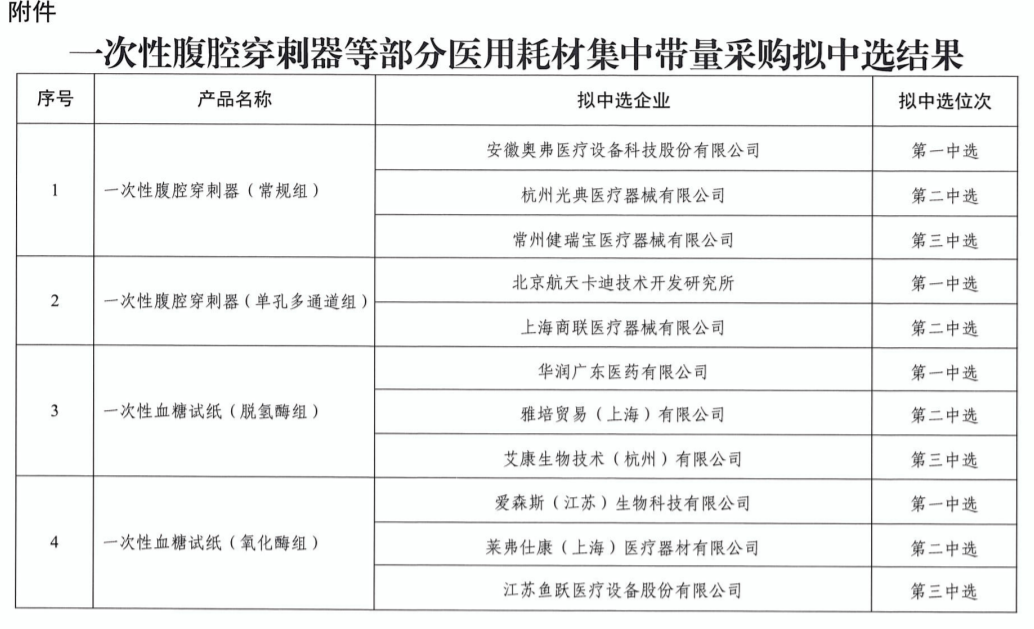 同时南京市医保局发布《一次性腹腔穿刺器等部分医用耗材集中带量采购拟中选结果公示》显示,本次拟中选企业包括雅培、华润、鱼跃医疗等械企。