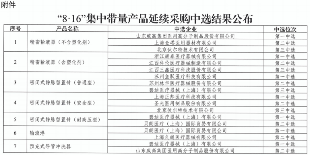 涉及BD、威高、贝朗、三鑫等械企的精密输液器、密闭式静脉留置针、输液港、预充式导管冲洗器等医用耗材(文末附名单)。