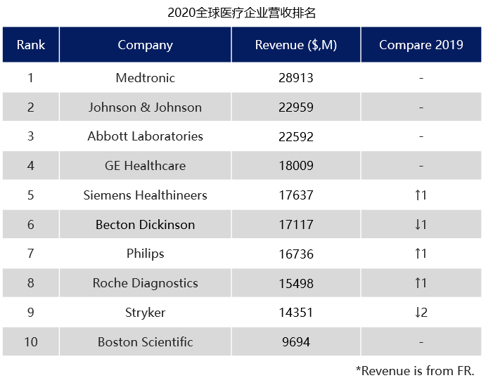 *汇率均以2020年12月25日当日汇率换算。以财报发布为基准。 *美敦力2020财年区间为2019年4月28日到2020年4月24日。 *碧迪医疗、西门子医疗2020财年区间为2019年10月1日到2020年9月30日。 2020年,全球前10医疗企业,仅雅培、飞利浦、罗氏诊断实现正增长。 美敦力、强生医疗、雅培、GE医疗仍然牢牢占据行业前4的位置。其中,雅培通过高达+13%的增长,坐稳“探花”位置,且距离排行第2的强生医疗仅有不足3亿美元的差距。 西门子医疗:通过其影像及临床治疗业务,整体营收维稳,排名上升1位占据第5; 碧迪医疗:虽然受益于新冠相关需求,如检测、监护等,但整体业绩-1%,排名下滑1位至第6; 飞利浦:凭借互联关护领域的高增长实现整体营收+4%,排名上升1位至第7; 罗氏诊断:新冠检测业务带动整体营收+14%,贡献了Top10中的最高增长,排名上升1位至第8; 史赛克:受到新冠检测带来的手术延迟等影响,排名下滑2位至第9; 波士顿科学:所有业务均受到不利影响,营收-8%,排名第10位。 美敦力(Medtronic) 2020年营业收入(百万美元):28913 2020年营收:-5% 研发费用:2331(占总营收 8%) 2020财年,受汇率以及新冠疫情的不利影响,美敦力迎来了多年来首次整体业绩下滑(-5%)。 虽然财务表现饱受挑战,但美敦力依然凭借289亿美元的营收占据了医疗榜“榜首”位置,与排名第二位的强生医疗拉开近50亿美元的差距。 关键业务表现:
