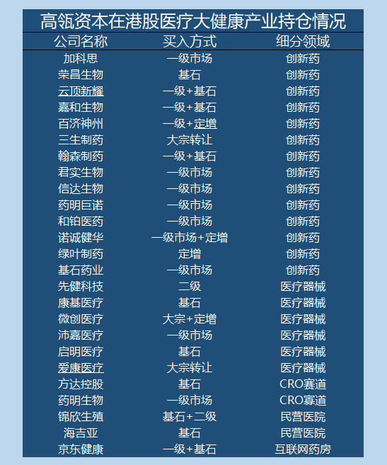 通过不是十分周全的统计,发现高瓴资本几乎横扫所有港股的医药大健康产业上市公司。因为高瓴资本旗下拥有数十个基金,统计或有疏漏。不完全统计,高瓴资本持有25家生物医药行业港股上市公司,其中创新药领域公司14家,医疗器械公司6家,民营医院2家,CRO公司2家,互联网药房1家。 ▲高瓴资本在港股医疗大健康产业持仓情况,来源:美柏医健整理《美柏医健》整理了其中几家较具代表性的公司一窥究竟。百济神州是高瓴资本的真爱。高瓴参与和支持了百济神州从成立以来的每一轮融资,在百济神州创立至今,高瓴资本从2014年的A轮开始,到2015年的起步期(B轮),从2016年纳斯达克上市,到上市后的定向增发,再到香港上市,高瓴是百济神州在中国唯一的全程投资人。2020年7月,高瓴资本又认购了百济神州不低于10亿美元的定增,这是全球生物医药历史上最大的一笔股权投资。根据高瓴最新的2020年四季度美股持仓情况看,百济神州已成为高瓴第二重仓美股,持仓金额高达14.14亿美元。目前,百济神州已经有两款创新药“替雷利珠单抗”和“泽布替尼”在多国获批上市,并开始产生盈利。同时,又与安进合作引进了多款具有竞争力的产品,自研管线和License in管线陆续进入收获期。据悉,百济神州已经启动了登陆科创板的上市程序,若能够顺利上市,根据A股较高溢价的现状,百济神州三地上市总市值将超过恒瑞医药,成为中国医药“一哥”指日可待。高瓴资本在嘉和生物的股份中占比第一,其中旗下公司HHJH持有1.36亿股,占总股本的29.02%。嘉和生物简直就是高瓴自家的创新药企,但这对一家创新药企可能不是件什么好事,因为话语权掌握在财务投资者而不是科学家手中,对公司的战略发展方向不利。嘉和生物研发管线还算丰富,涵盖15款靶向候选药物,其中包括全球前三大肿瘤靶标和十款最畅销药物中的五款。从研发进度看,其中3个产品曲妥珠单抗(抗HER2人源化单抗)、生物类似药英夫利昔单抗(注射用重组抗TNF-α人鼠嵌合单抗)、生物类似药利妥昔单抗均已处于三期临床试验阶段。授权引入的PD-1进度最快,目前已提交上市申请。但通过分析嘉和生物的研发管线,发现其前景并不具备明显的优势。PD-1赛道已经十分拥挤,竞争已是一片红海,后续未上市的梯队可能分不到太多的市场份额。曲妥珠单抗的研发也处于第二梯队,竞争对手复宏汉霖已有产品抢先一步获批上市。高瓴重仓嘉和生物的逻辑是什么,可能还需时日才能清晰。瀚森制药是港市医药龙头之一,主攻中枢神经系统、抗肿瘤、抗感染、糖尿病、消化道和心血管六大领域。从细分赛道来看,它是中枢神经系统疾病中精神疾病药物的龙头。其创始人钟慧娟大有来头,她是国内制药龙头恒瑞医药实控人、董事长孙飘扬的妻子。财务指标上,翰森制药在一众未盈利或无营收赴港上市的生物科技企业中格外耀眼,2017年、2018年、2019年收入分别为61.85亿元、77.22亿元、86.83亿元,净利润分别为人民币15.96亿元、19.03亿元、25.57亿元。股权结构相对集中,根据2020年中报,实控人钟慧娟的信托基金持股占比65.89%。高瓴在2016年2月瀚森制药第一轮融资时就已入场,总代价为1.9亿美元认购300股优先股;作为基石投资者再次认购1604.2万股,两次认购股份占总股份3.19%。2020年3月,高瓴资本买入三生制药8.40亿股,预估投资额达58亿港元左右。高瓴入局三生制药的投资逻辑可能有几个方面:一是估值便宜,入局时三生制药大约14倍PE;二是子公司三生国健冲击科创板,并且拥有丰富的在研管线;三是看中1500亿的血液透析服务市场。三生制药2007年曾经在美国纳斯达克上市,是中国最早上市的生物制药企业,2013年完成美股私有化退市,2015年在香港上市,2015年三生制药出资39亿元收购了一家国内领先的抗体生产企业“中信国健”,同时取得第三个核心产品“益赛普”。中信国健是国内单抗行业研发和生产的龙头企业,还能提供对外CMO业务,不止体量中国最大,也是从细胞系、培养基、原液到制剂的全球最完整生产线之一。三生制药旗下拥有多个畅销的单品,其中特比澳2020年上半年占据中国内地治疗血小板减少症市场份额的72.8%(以销售额计算);益赛普是中国内地市场推出的首个依那西普产品,在中国内地TNFα市场占据支配性领导地位,其于2020年上半年占中国内地市场份额54.5%;益比奥自2002年起一直于中国内地rhEPO市场占据优越主导地位。但三生制药此前因为商誉高悬,受到的关注程度不高,目前股价从高位回落,与高瓴入局时相差不多。2021年1月,绿叶制药宣布引入高瓴资本作为战略投资者。以定向增发新股方式获得高瓴12.5亿港元融资;高瓴亦以相同每股价格获得受让绿叶制药部分已发行股份。两笔交易总金额累计为港币24亿元,交易完成后,高瓴资本将持有绿叶制药15.60%的股份。在此之前,绿叶制药表现平平,股价长期在低位运行。母公司绿叶集团比较激进的并购战略,导至其商誉高悬。绿叶制药深耕肿瘤、中枢神经、心血管、消化与代谢四大领域,目前已有2款新药获批,4个上市申请,11个临床三期或关键性临床项目。有分析认为,高瓴此次入局绿叶制药,是透视了其价格背后真正的价值,或许意味着绿叶制药价值回归的分水岭已经来临。目前,绿叶制药市值在180亿港元左右运行。高瓴于2020年8月在京东健康的B轮融资中入场,投资金额超过8.3亿美元;而后又在基石投资者中认