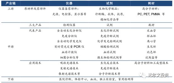 1. 行业基本情况 体外诊断(IVD)能够影响60%的临床治疗方案,但其费用只占整个临床治疗费用的2%,因此体外诊断具有较大的商业价值以及实际意义。 体外诊断按检测原理或检测方法分类有生化诊断、免疫诊断、分子诊断、血液、尿液诊断、微生物诊断、即时检测(POCT)等七大类。 体外诊断产业链是由上游原材料、中游体外诊断试剂和仪器、下游服务和需求共同组成。