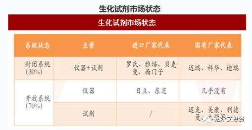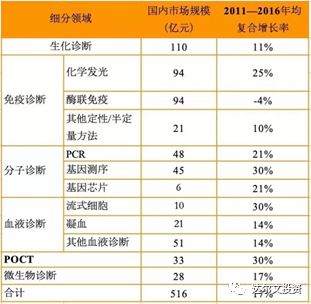 中游汇集了国内绝大部分体外诊断公司,在生化、免疫、血细胞、微生物、分子诊断等领域进行仪器和试剂生产销售。 IVD是医疗器械细分领域中销售额排名第一的领域,2017年全球销售额达到526亿美元,占比达到13%。心血管、影像、骨科、眼科则分别排名第二到第五。 我国体外诊断产业以20%左右的年增速快速成长。IVD成为国内整个医疗器械行业中增速最快的细分市场。但按全国人均计算,我国每人每年的诊断支出仅5美元左右,远低于发达国家平均25~30 美元的水平,仍处于行业生命周期中高速发展阶段。 据《中国体外诊断产业发展蓝皮书》统计数据显示,预计到2019年我国体外诊断产品市场规模将达到723亿元,年复合增长率达18.7%,中国体外诊断市场规模增速明显高于全球平均水平。 2016年国内体外诊断细分市场规模及其增速情况如下表所示。化学发光免疫诊断是所有细分领域中最具潜力的领域。迪瑞医疗过往几年在化学发光免疫诊断领域进行大量资源投入,用于新产品的研发,目前已形成产品,正在推广销售阶段,未来前景可期。 迪安医疗的产品原来以生化、尿液、血液分析为主,近两年增加免疫、妇科分泌物分析两大类。公司IPO后在年报中就没有披露各产品的营业收入,因此,具体比重不好分析。只能从公司拥有的注册证数据进行推测。 截至2018年底,公司已获得的国内医疗器械注册证219项。其中,诊断仪器产品44项;生化诊断产品92项;免疫诊断试剂产品39项;尿液分析试纸、试剂及相关配套产品26项;血细胞分析试剂产品8项;妇科分泌物分析试剂及相关配套产品7项;便潜血分析试剂及相关配套产品3项。 公司子公司宁波瑞源已获得医疗器械注册证119项,其中诊断仪器1项,生化诊断试剂产品118项。 我们推测,生化和尿液分析是公司的基本盘,免疫诊断和妇科分泌物分析是增量业务。 生化分析 生化诊断目前技术和市场都处于成熟期,市场容量增速预计只有个位速的增长。生化诊断的发展趋势主要是存量市场的竞争,市场的中集中度得到提升,价格下降是趋势。 2010 年,我国临床生化诊断的市场规模为 40 亿元,预计 2015 年达到 61亿元。由于国内生化诊断市场已趋于成熟,加上部分项目被化学发光免疫诊断替代,行业增速呈现逐渐下滑趋势,但生化诊断在成本和时间上具有明显优势,在初诊过程中的一些定性检测项目上仍是首选,预计未来 5 年将以 5-7%的增长率低速增长。 目前生化诊断试剂基本完成进口替代,国产占有率已达70%,但高端仪器仍由外资主导,国产占有率不足10%仪器。 在生化诊断,各公司的市场占有率情况如下。从市场占有率来看,行业集中度不高,技术门槛不太高,竞争比较激烈。 迪瑞医疗的业务中,生化分析依然占主要地位。很显然,受行业特性及发展趋势的约束,公司的生化分析业务保持着稳定,过去几年仅保持个位数增长。可以预见,未来几年,公司在这块业务保持着稳定发展,很难有突破性发展。 尿液分析 中国尿液分析市场的规模已自2013的约人民币7亿元增加至2017的约人民币15亿元。到2022年,中国尿液分析IVD的市场预计增至约人民币34亿元,自2017年至2022年的复合年增长率约为17.8%。2017年中国尿液分析IVD的市场的三大制造商为优利特、希森美康及迪瑞,市场份额分别约为36.8%、30.2%及13.4%。 迪瑞与前面两名差距较大,处于追赶阶段,但是,处于第三的位置,说明技术水平不错。尿液分析市场还有两位数的年增长,只要迪瑞维持着行业地位,也因此会获得不错的成长。尿液分析前三名占据了近80%的市场份额,说明存在竞争壁垒,竞争烈度比较小。 免疫分析 免疫诊断已经成为我国体外诊断市场规模最大的细分市场,约占整个体外诊断市场份额30%,并且增长迅速。2010年,我国免疫市场规为模约为45亿元,2015年规模达到95亿元,年均复合增速为16.1%。 在免疫诊断领域,化学发光市场规模发展最快,从2010 年的 20亿元左右增长到 2015 年的 69 亿元,年均复合增长率 28%。目前正在发生的趋势是化学发光优势显著,正在替代酶联免疫。 化学发光免疫技术门槛高,研发难度大,国内的化学发光市场基本被以罗氏、雅培、西门子、贝克曼为代表的外资巨头垄断。罗氏在中国化学发光市场占有率为 47%,雅培为 26%、贝克曼(丹纳赫)为 15%,西门子约为 6%。国产产品市场占率不到5%。 处于市场垄断地位的罗氏、西门子和雅培公司的全自动化学发光免疫分析系统产品均采用了该领域最先进的纳米免疫磁性微球分离技术和非酶的小分子有机化合物标记技术,均属于典型的直接化学发光技术。 国内企业已在技术上进行追赶,部分企业在化学发光的仪器和试剂取得突破,这包括新产业、安图、迈克生物、科华等。 迪瑞2017年在化学发光免疫分析领域的研发和注册取得进展。公司新推出CM-180全自动化学发光免疫分析仪,采用了国际主流吖啶酯标记化学发光检测技术。CM-180全自动化学发光免疫分析仪是迪瑞医疗十年磨一剑的产品。2018年开始推广和销售。从公开信息暂看不到相关产品的实际销量。 在化学发光领域,有几个大趋势:1)化学发光市场本身在快速发展。2)国产设备及试剂的市场占有率不到5%,国产替代是大势所驱。3)国内厂商的差距目前并不大。 在这种趋势下,迪瑞已成功研发相关产品,并获得了注册证,取得一定的市场份额是大概率事件。 综上所述,迪瑞医疗的基本盘包括生化和尿液分