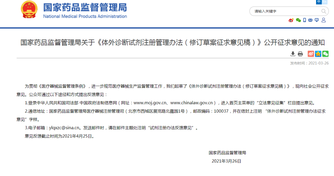 近日,国家药品监督管理局公布了《体外诊断试剂注册管理办法(修订草案征求意见稿)》并向社会公开征求意见。