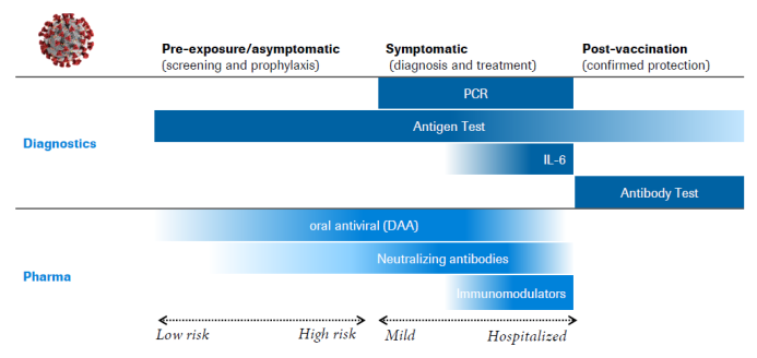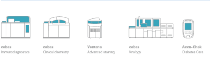 截止到2020年底,罗氏在150多个国家拥有雇员已经达到10万人,营收达到583亿法郎,其中诊断业务达到138亿法郎,得益于新冠产品的布局,从去年的财报到今年罗氏的各种报告和新闻,提及最多的就是“in the fight against covid-19”, “SARS-COV-2 test” “Pandemic”对待这场疫情,我们看到了巨头的社会责任感与担当,罗氏的社会责任感与担当也收获了前所未有的业绩回报,今年一季度诊断业务达到了43.3亿法郎,大涨55%,与新冠业务相关POCT产品营收达到了7.16亿法郎,这样的一个巨无霸在新冠疫情中将危机转化为机遇,IVD一哥罗氏正在用其125年风雨智慧与经验为大家上一堂难得的转为危机全方位布局的课程。 在此笔者应用了Roche财报年终总结的一段话,“罗氏在他125年当中遇到过也化解过各种各样的挑战,在这场与COVID-19新冠抗疫的过程中我们将更加增强我们的合作能力,我们将涅槃重生,成就更强大的自我。” 新冠方案从“诊”到“疗”全方位布局 罗氏是一家典型的药械相结合的巨头,上游检测诊断,下游药物治疗,诊断与Pfizer,阿斯利康等相比他的诊断器械更强,与Danaher,西门子等器械相比,他的药品又更强。罗氏集团全方位的诊断,利用大数据云计算进行诊与疗的搭建,前段提供诊断,后端提供罗氏药物治疗,形成 “诊”到“治”的无缝对接在新冠检测方面也如此: 诊断检测端:拥有分子PCR检测,抗原抗体antibody,antigen Naturalizing antibodies检测. 治疗端:high risk 到mild再到Hospitalized. 诊断业务从中心实验室临床检验到POCT两大产业线并驾齐驱 要想了解ROCHE的诊断新冠布局,我们先来了解Roche诊断家族产品:COBAS系列实验室(覆盖了免疫,大生化+化学发光+分子+血气电解质+凝血+病理+五分类+尿检等),+PCOT Accu系列(血糖+血脂+血凝+心肌+分子传染病检测+与SD组合快诊新冠检测等)形成两翼傲视群雄,高冷巅峰,有了这些基础武器,就可以随意搭配,打满组合拳。 市场中主要新冠检测为以下几种从高大上的分子核酸检测到最底层的胶体金检测,检测场景从中心实验室专业检测到胶体金家用自测检测: 1.新冠分子检测molecular(RNA提取,COVID-19 PCR检测), 2.化学发光CLIA(化学发光COVID-19抗体抗原,以及中和抗体检测) 3.酶联免疫ELISA(COVID-19抗原抗体,中和抗体检测) 4.免疫荧光(COVID-19抗原抗体,中和抗体) 5.分子POCT(COVID-19提取+扩增) 6.胶体金lateral flow COVID-19抗原抗体检测,以及中和抗体检测 结合Roche诊断产品布局,基本上涵盖了大部分主流检测 中心实验室高通量确诊布局 罗氏新冠分子检测布局:Cobas6800/8800目前是市面上样品处理,提取以及扩增读取集成度最高分子检测产品的巅峰产品之一,不仅自动化与通量高,目前的可提供的试剂2000万每月。主要布局国家中心实验室,第三方实验室,中大型医院。 主要为: •cobas®SARS-CoV-2 •cobas®SARS-CoV-2 & Influenza A/B 罗氏新冠化学发光检测布局:Cobas e411/601/602/801,新冠化学发光从高通到低通量全方位布局中心实验室,第三方实验室,中小型实验室。 •Elecsys®Anti-SARS-CoV-2 •Elecsys®Anti-SARS-CoV-2 S •SARS-CoV-2 rapid antibody •Elecsys®Anti-SARS-CoV-2 antigen POCT快速筛查,家用布局 POCT分子 检测布局:cobas liat在中小型医院以及实验室,采用非传统的微流控芯片结构。整个芯片类似于试管形状,检测管包含所有检测试剂并已分装入每一个独立区段,将所有核酸检测程序融为一体。其中包含试剂准备、样本富集、抑制物清除、核酸提取及实时荧光定量检测。 •cobas®SARS-CoV-2 & Influenza A/B (POC)