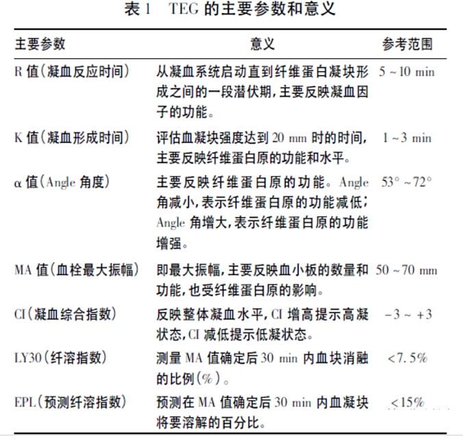 典型的TEG检测结果见图所示,其中各个指标的定义以及临床意义、参考范围见表1.现代输血主张成分输血,应用TEG检测,指导血液成分输注,可降低血液制品用量,降低输血传染疾病的风险。目前,临床医师对输血指征的判断主要参考血常规和凝血3项的检测结果。血常规能够定量检测血红蛋白和血小板,凝血3项是检测无红细胞参与的状态下血浆中凝血因子的活性。TEG检测可全面动态反映从开始凝血至血凝块溶解的全过程,包括凝血因子、血小板、纤维蛋白原在这一过程中的作用及纤维蛋白溶解情况。因此,TEG在指导临床输血中的优势是,可准确分析导至患者凝血功能障碍的影响因素,从而选择相应的血液制品进行补充纠正,既做到了科学合理的成分血液输注,节约了血液资源,挽救了患者的生命,又避免了不必要的血液制品的输注和经血传染疾病的风险。