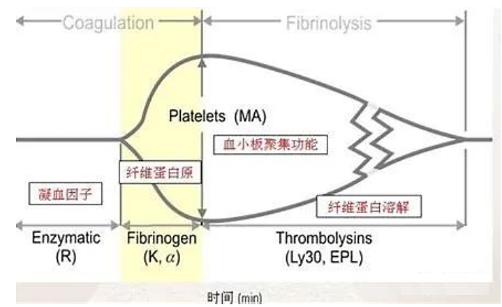 出凝血功能异常是临床上常见的症状,血栓和出血一直是影响患者生命安全的重要因素,如何快速评估患者凝血状态十分重要。 目前临床上较为常用的一些检测项目, 如 DIC 全套、凝血因子含量测定、凝血酶-抗凝血酶Ⅲ复合物( TAT) 、血浆纤溶酶-抗纤溶酶复合物( PAP)等在一定程度上存在敏感性、特异性不足的问题。理想的凝血测试应简单易操作,快速获得结果,同时具有较高的可靠性和稳定性,能准确估计血栓形成和出血风险。此外,其还能模拟血液流动条件、内皮相互作用、血小板作用及生理条件,如pH和温度。血栓弹力图仪( TEG)是 1 种从血小板聚集、凝血、纤溶等整个动态过程来监测凝血过程的分析仪,其原理是基于凝血过程的最终结果为形成血凝块, 而血凝块的物理特性(血凝块强度和稳定性)决定其是否具有正常凝血功能。与常规检测方法相比,TEG更加快捷、精确, 是整体评价凝血功能的1个敏感实验。近年来, TEG在监测术中输血、抗血小板药物治疗、预防血栓及溶栓等方面的应用都有很大发展。血栓弹力图由Hartert于1948年提出,提出了一个可以监测全血凝集过程动力学的方法,他称之为血栓弹力图 (Thrombelastography, TEG)。新鲜的全血离体后被放入一个特制杯子中,通过接触途径迅速被凝血启动因子激活,接着一根扭力丝被放入这个混合杯中,并且不断地以固定角度的进行转动。随着血凝块的形成,扭力丝所遇的阻力会不断增大,当血凝块完全形成,扭力丝运动会完全受阻,其运动轨迹可以通过与其连接的计算机系统获得,因此我们可以获得血块形成的开始时间和形成最大血块的振幅等数据,这个方法同时还可以检测由纤溶导至血块的逐步溶解过程。这个检测方法一经面世,立即就在全世界范围引起了巨大的争议。其中一个有争议的地方在于这个方法对外环境的震动过于敏感,而且不能对某种凝血因子缺乏进行检测。同时这个试验耗时太长,操作过于复杂,因此一直未在全世界范围之内得以应用。然而随着仪器自动化的发展和商品化凝血启动因子的引入,TEG这一技术很快在全世界得以推广和应用。在90年代中期它作为一个重要的床边试验用来监测肝移植和心脏手术的止血情况。在过去的10年中,TEG被认为特别适用于创伤,心脏外科大手术和肝移植患者,尤其是在这些患者纤维蛋白原水平特别低的情况下。TEG现在被认为是在床边特别是在手术状态下用来监测凝血和指导抗凝治疗的一个重要工具,已经证实它可以检测过量的肝素效应,同样还能获得外科手术中血液过度稀释的征兆。由TEG 结果指导的治疗也可以节约血液输注量和降低治疗成本。同样,它还可以应用于监测产科手术的出血和治疗指导。TEG仪主要由测试杯、金属探针及与之相连接的传感器构成。预先将测试杯温度调节至37℃,加入少量血液标本,金属探针放入测试杯中,测试杯被安置在以4°45′角度、每周期持续10s转动的反应座上,模拟血管中缓慢的血流。起初,血液标本是液体,测试产生的运动不会影响探针,但随着血液开始凝固形成纤维蛋白桥,作用于探针和杯壁间,逐渐产生阻力。此外,由于血液标本中的纤维蛋白会黏附于探针,进一步产生阻力,从而影响探针。探针在测试杯旋动过程中对杯内磁力线进行切割,进而产生电流。随着纤维蛋白桥产生增多,血凝块不断生成,阻力不断增加,产生的电流也发生相应的改变。达到血凝块最大强度后,随着纤维蛋白溶解,血凝块逐渐溶解,测试杯和针的纤维蛋白结合被破坏,测试杯运动的传递减少,探针受到的阻力逐渐减小。探针在整个过程中随着阻力的不断改变而旋动,从而产生不断变化的电流信号。信号经过电脑软件的处理后形成相应的曲线,进而获得TEG的一系列参数。其中除了血凝块形成的相关数据外,还包括纤溶导至血块逐步溶解的过程,所以通常可以将TEG曲线图分为2个部分,即凝血曲线与纤溶曲线。