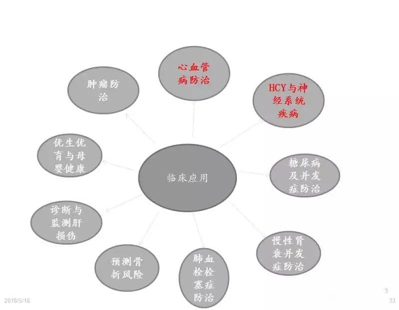 | | | 具有很高的准确度和稳定性,缺点是处理标本的能力有限,临床实验室未配备设备及操作人员,常作为同型半胱氨酸检测的参考方法; | | | | 灵敏度高特异性强,但精密度差,耗费人力,操作时间长,不适宜做单个标本和急诊标本。 | | | | 可在大型生化分析仪上使用,操作简单,结果准确可靠,且可和其他参数进行同时分析,目前最为常用的临床检测方法。 | Ø目前国际市场上,能够在生化分析仪器上使用的Hcy试剂有两种,都是循环酶法。一种为直接法(水解酶循环酶法),另一种为间接法(胱硫醚循环酶法)。Ø水解酶循环酶法,该法特异性高、抗干扰力强、能够消除内生β-胱硫醚,适用于各种生化仪,该类产品被国际大公司(如罗氏, 奥林帕斯等)广泛采用。Ø胱硫醚循环酶法不能够消除内生β-胱硫醚,而恰恰有很多人,尤其是肾脏疾病患者的内生β-胱硫醚水平非常高(可高达>300μmol/L,大部份< 20μmol/L)。因此间接法的Hcy试剂受到了内生胱硫醚的明显干扰。另外,间接法试剂易受脂肪酶、铁试剂干扰。间接法优点就是价格便宜。李建平等【11】研究发现,血同以10μmol/L基线,中国高血压患者中75%伴有高血同,其中男性占91%,女性占63%。表1显示,我国成人血同的几何均值在13 - 14μmol/L之间,男性高于女性。45岁以上人群中,75%的男性超过10. 5μmol/L,50%的女性超过10.7μmol/L。Yang Q等【12】统计美国人群的血同平均值为9. 4μmol/L,而我国人群要高出40% ~50%。4.1 高血同与脑卒中 高血同是引发脑卒中的独立性危险因素,血同值高于10. 50μmol/L人群的卒中风险增加到4.2倍【16】。Framingham队列研究显示,血同值≥14.24μmol/L的人群罹患卒中风险是血同值≤9. 25μmol/L人群的1.8倍【17】。4.2 高血同与痴呆 Hcy作为神经毒素,通过断裂DNA引发细胞凋亡,促进神经变性【18】,包括阿尔茨海默病(Alzheimer disease, AD )、帕金森病 (Parkinson's disease,PD)等和血管性痴呆(vascular dementia,VD)等。血同可用于预测AD的风险【19】,不仅与认知损害相关,也与认知受损程度相关。Meta分析显示高血同导至AD的相对危险度是1.15(95% CI= 1.02 -1.27) 【20】。4.3 高血同与心血管疾病 动脉粥样硬化的形成归因于同型半胱氨酸化脂蛋白与微生物的聚集,在动脉易损斑块形成过程中阻塞了血管,进而发生心血管事件。Hcy合作研究项目发现,所有冠状动脉疾病的10%归因于高血同。血同每增加5μmol/L会 使缺血性心脏病的风险增加84%【2】, Robinson K 等【21】发现每提高3μmol/L增加35%的风险,而 Wald DS等【22】发现每下降3μmol/L可使缺血性心 脏病发病率下降16% ,深静脉血栓形成发病率下降 25%。血同与生存率也有密切关系,Nygard O 等【23】发现,血同高于20μmol/L的冠心病患者5年生存率低于65% ,而若降低到9μmol/L以下则可以提高到95%的生存率。4.4 高血同与高血压 Hcy引起钠重吸收,刺激血管平滑肌细胞增殖并改变血管壁的弹性,从而导至高血压。血同与收缩压和舒张压呈正相关,每增加 5μmol/L可使收缩压增加0.45mmHg,舒张压增加 0.47mmHg【24】。高血压的患病率与血同呈正相关,血同≥10μmol/L和≥15μmol/L对应的高血压患病率分别为31.4%和39. 2%。H型高血压具有显著的协同作用,是单独高血压罹患脑卒中风险的4倍【25】。4.5 高血同与糖尿病并发症 伴有高血同的糖尿病患者更易发生大血管损伤和微血管病变。Passaro A等【26】对2型糖尿病患者的研究发现,血同每增加1μmol/L,发生心血管疾病的OR值为1.45,Ambrosch A[27]发现每增加5μmol/L发生神经病变的风险增加2.3倍,血同每增加5μmol/L,发生糖尿病肾病的风险增加3.86倍,MTHFR C677T位点TT 基因型发生肾病的风险增加1.57倍【28】。4.6 高血同与慢性肾脏病 肾脏在同型半胱氨酸的代谢清除中发挥了关键的作用【29】。高血同与肾功能减退和肾小球滤过率负相关,是慢性肾脏病进展的独立危险因素【30】。Mallamaci F等【31】发现,血同高于37. 8μmol/L的肾透析患者5年生存率不足65%,而血同低于22. 9μmol/L的肾透析患者5年生存率可以超过95%。4.7 高血同与骨骼 高血同对成骨细胞和破骨细胞具有有害作用,破坏胶原分子的交联,减少骨量,而导至骨强度降低。男性高血同患者在3年内发生骨折的RR值为3.8,女性为2.8。MTHFR C677T位点TT基因型患者发生骨折的OR值分别为7. 21 【32】。4.8 血同与妊娠期疾病 血同通过血管内皮损伤、绒毛膜血管化不良、胚胎发育异常等机制导至妊娠期高血压、妊娠期糖尿病、胎盘血管病变、习惯性流产等【33】。血同也是神经管缺陷的一个独立危险因素, 直接影响神经管闭合程度,进而导至胎儿畸形【34】。女性怀孕后血同值下降,并且随孕早期、孕中期和孕晚期而变化,国外一项对不同孕期血同水平的研究结果分别为5. 6μmol/L、4. 3μmol/L、3. 3μmol/L【35】,我国的一项研究结果则分别为8. 17μmol/L、8.34μmol/L和9.53μmol/L【36】。Hobbs CA等【37】发现,血同值>8.59μmol/L的孕妇,生育先天性心脏病患儿的风险增加5.22倍。因此,血同值可以作为孕妇的一项常规指标来评估妊娠期疾病和出生缺陷发生的风险。4.9 高血同与男科疾病 高血同通过影响精子生成和精子功能而导至不育症【38】。戈一峰等【39】研究证实,少和/或弱精子症患者血同均显著高于健康对 照组,血同水平越高,精子浓度及活力越低。血同与男性勃起功能障碍(erectile dysfunction, ED)显著相关,改善血同可以预防ED。高血同导至ED的OR值为3.04【40】。4.10 高血同与肿瘤 肿瘤与DNA合成和