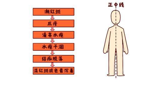 带状疱疹患处会先出现潮红斑,很快出现粟粒至黄豆大小丘疹,成簇状分布而不融合,继而迅速变为水疱,疱壁发亮,疱液澄清,外周绕以红晕。皮损沿某一周围神经区域呈带状排列,多发生在身体的一侧,一般不超过正中线。水疱干涸、结痂脱落后留有暂时性淡红斑或色素沉着。