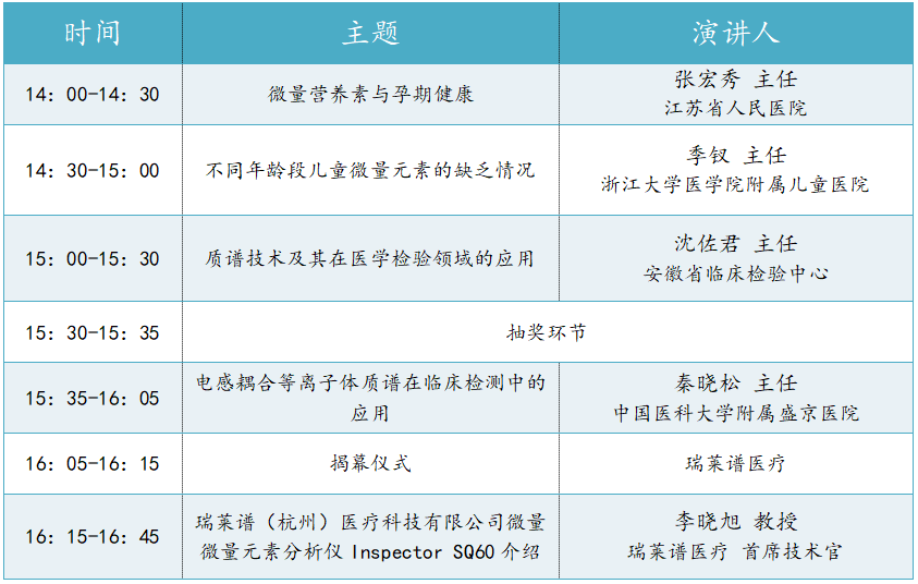2021年5月29日14:00—16:45,瑞莱谱医疗电感耦合等离子体质谱仪 ICP-MS(微量元素分析仪Inspector SQ60)线上新品发布会即将在“检验医学网”盛大举行! 本次发布产品“微量元素分析仪Inspector SQ60”是国内首台原研临床自动化电感耦合等离子体质谱仪ICP-MS。瑞莱谱医疗将带来全新的微量元素检测整体解决方案。同时,还邀请了业界诸位大咖分享临床微量元素检测技术的发展,共同探求微量元素精准检测新时代。 会议日程 专家介绍 张宏秀 南京医科大学第一附属医院、江苏省人民医院妇产科主任医师 医学博士,副教授,硕士生导师 2011年1月-2012年1月在宾夕法尼亚州立大学Hershey医学中心做访问学者及博士后研究 世界中医药学会联合会盆底医学专业委员会常务理事 世界中医药学会联合会生殖医学专业委员会理事 江苏省医学会继发性骨质疏松学组委员 江苏省医师协会骨质疏松与骨矿盐病症医师分会第三界委员会委员 中国优生科学协会妇儿免疫学分会委员 江苏省研究型医院学会阴道镜与宫颈病理专业委员会委员 江苏省妇幼保健协会变态反应学分会第一届委员会委员 《中国医药科学》杂志和《实用临床医药杂志》审稿专家 获得2010年度医学教育研究立项课题)。主持国家级、省部级等科研项目3项,其中国家自然科学基金1项;发表论文30余篇,其中SCI收录10余篇。 季钗 浙江大学医学院附属儿童医院儿童保健科副主任 儿科学博士 中华医学会儿科儿童保健专业青年学组委员 中华医学会儿科学分会预防接种委员会委员 浙江省预防医学会儿童保健专业委员会委员 浙江省预防医学会免疫规划专业委员会委员 浙江省医师协会妇幼保健医师分会委员会委员 中国妇幼保健协会儿童早期发展专业委员会高危儿童管理学组成员 中国疫苗行业协会预防接种专业委员会委员 浙江省妇幼健康协会(生缺陷防治)专委会委员 先后从事儿内科和儿童保健科的临床、教学和科研工作共20余年。主要从事早产儿随访、特殊儿童的免疫接种咨询及威廉综合征儿童的随访研究。 沈佐君 安徽省临床检验质量控制中心常务副主任 医学博士,一级主任技师,教授、博士生导师 中国科学技术大学附属第一医院医学伦理委员会主任委员 1998年获中国协和医科大学医学博士学位 1998年至2000年美国哈佛大学医学院博士后 主要从事分子诊断、高效毛细管电泳和液相色谱等技术临床应用研究 第八届国家卫生计生突出贡献中青年专家 享受国务院特殊津贴 中国医学装备协会临床检验装备技术专业委员会副会长 中国医师协会临床检验专业委员会常委 中国医院管理协会临床检验专业委员会常委 中国医学老年检验医学分会常委 中华医学会检验医学分会分子诊断学组副组长 安徽省医院协会临床检验专业委员会主任委员 医学实验室认可主任评审员 《临床输血与检验杂志》副主编 《中华检验医学杂志》编委 《临床检验杂志》编委 《临床医学》编委 《分子诊断与治疗杂志》编委等职务。 秦晓松 中国医科大学附属盛京医院检验科主任 教授,医学博士,博士/博士后导师 辽宁省医学会检验分会 副主任委员 辽宁省医师协会检验医师分会 副会长 中国中华检验医学教育学院 辽宁分院 秘书长 中华医学会检验专业委员会临床免疫学组委员 中国医师协会检验医师分会甲状腺疾病专委会副主任委员 中国中西医结合学会检验医学专业委员会常务委员 中国分析测试协会标记免疫分析专业委员会常务委员 妇幼健康研究会 检验医学专业委员会 副主任委员 世界华人检验与病理医师协会委员 老年医学学会检验分会委员 中国微生物学会临床微生物学专业委员会委员 中国药理学会肾脏药理专业委员会委员 辽宁省中西医结合学会检验医学专业委员会 副主任委员 临床化学(中文版)编委 曾于日本德岛大学医学部留学、美国哈佛大学医学院、意大利圣·乔万尼医院(San Giovanni di Dio Hospital)进修学习。主要从事生化与分子生物学及抗感染免疫、疾病诊断标志物筛选、实验室质量管理等领域的研究。沈阳市高级人才,主持和参与了多项国家及省部级课题,获经费近300余万元。获辽宁省自然科学学术成果奖二等奖1项,发表论文60余篇,其中SCI收录17篇。多次受邀在国内外学术会议上进行报告。 李晓旭 苏州大学机电工程学院副教授 瑞莱谱(杭州)医疗科技有限公司 首席技术官 中国仪器仪表学会青年学术委员会委员 质谱专业技术委员会委员 先后承担国家自然基金面上项目、青年科学基金项目、江苏省自然基金项目、苏州市科技资助项目、苏州大学自然基金项目和苏州大学人才引进项目各 1 项,参与国家重点研发计划项目 1 项,承担横向科研项目 6 项。近几年承担和参与的横向及纵向项目为 13 项。 近年来,发表学术论文 12 篇,其中 SCI/EI 检索论文 9 篇。申请中国发明专利15项,其中获得授权发明专利 8 项。 提出了电子轰击电离源“脉冲式电离技术”和离子阱“宽频共振激发技术”,前者提升了样品的电离效率和离子存储效率,后者提升了离子阱的碰撞诱导解离(CID)效率和稳定性。 成功研发:小型化大气压电离源-线形离子阱质谱仪、新型的便携式气相色谱-线形离子阱质谱仪、线形离子阱-紫外激光光电子能谱仪、红外激光-线形离子阱-飞行时间质谱仪联用仪等多种质谱仪器。 产品介绍 ◆ 2021年04月,瑞莱谱医疗微量元