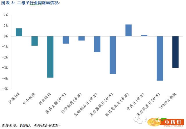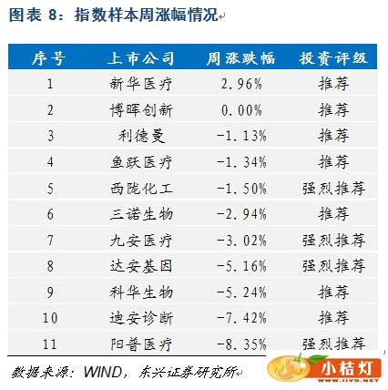 本周IVD行业指数样本普遍下跌,仅新华医疗上涨,涨幅为2.96%。本周跌幅较大的样本为阳普医疗、迪安诊断和科华生物,跌幅分别为8.35%、7.42%和5.24%。