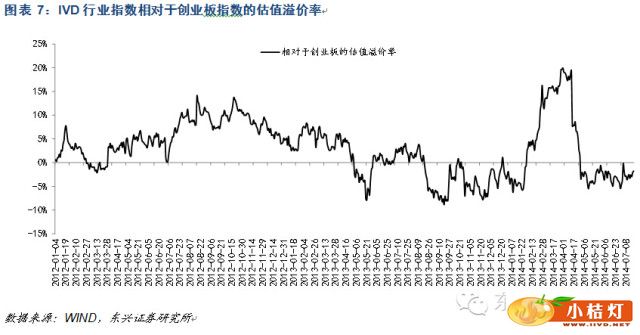 截至报告期收盘,IVD行业指数的估值(历史TTM-整体法)为53.70倍,相对于沪深300指数的估值溢价率为562.96%,相对于中小板指数的估值溢价率为62.78%,相对于创业板指数估值溢价率为-1.77%,相对于SW医药生物指数的估值溢价率为55.47%。