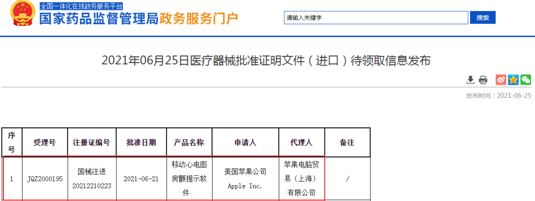 6月26日,Apple Watch 获得国家药品监督管理局医疗器械审批,在国家药品监督管理局公布的《医疗器械批准证明文件(进口待领取信息)》中,美国苹果公司Apple Inc.的移动心电图房颤提示软件(注册证编号为国械注进20212210223)注册在列,完成审核,苹果手表用户或许不久后便可在更新中获得该功能。 根据此前苹果健康 App 里心电图功能介绍,如果启用服务后,可以在 Apple Watch 上做心电图," 心电图 "App 使用 Apple Watch 的数码表冠记录心跳,然后 App 会检查是否出现房颤,心律不齐的一种形式。心电图 ( ECG 或 EKG ) 检测功能可以让用户随时随地了解自己的心脏状况,可以避免一些意外情况的发生。 实际上,苹果在2018年发布的Apple Watch Series 4 上就推出了ECG 心电图检测功能,并获得FDA批准,一时在医疗布局上被看成是“巨大的飞跃”。但由于该功能属于医疗器械属性,苹果未能成功通过中国药监局的医疗器械认证,4代手表发布之初在国内并不支持该功能,这让拥有ECG心电图功能的国行Apple Watch失去了很多进入国内市场机会。智能手表为数不多的差异化卖点