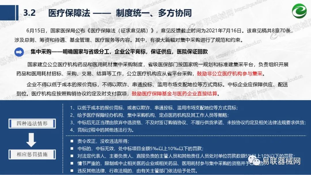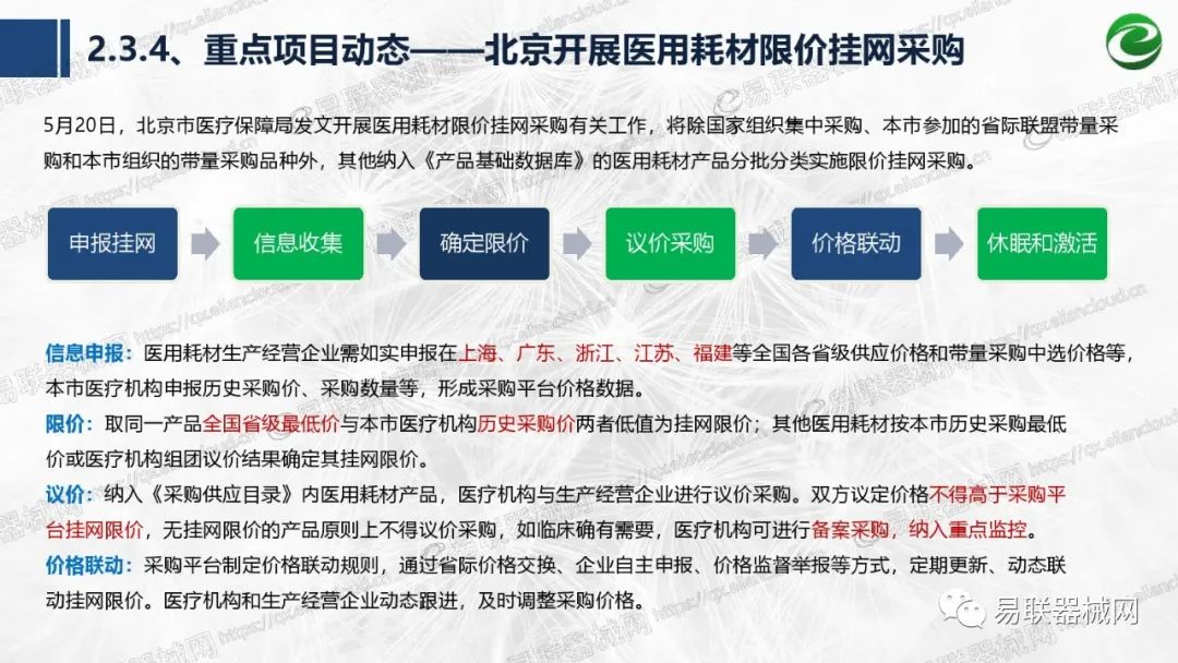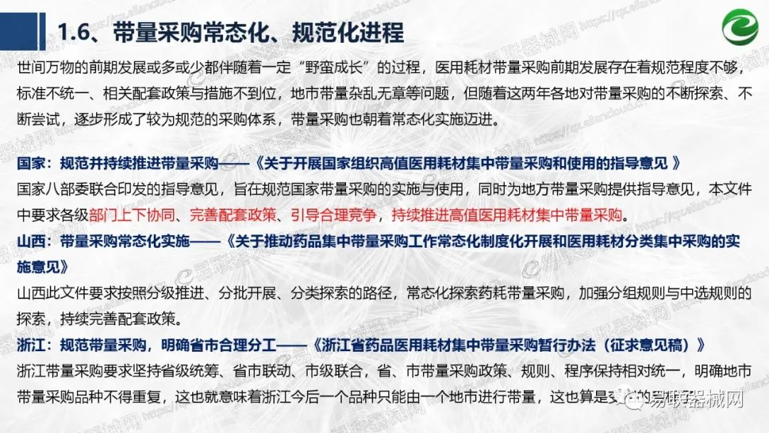 带量采购方面:2021年上半年,带量采购持续发力,仍是行业内的焦点所在。首批带量采购项目即将届满,相应续标工作有序展开;带量采购常态化、规范化文件相继出台,引领耗材带量采购走向新的篇章…… 常规项目方面:各地挂网工作有序开展,新老平台切换稳步推进;地方工作上:北京耗材限价挂网、内蒙古简化挂网流程、四川与江西规范并完善药耗集采工作、河南持续推进阳光挂网、海南实行“红黄绿”价格预警…… 政策方面:八部委联合印发带量采购规范文件,指导高值医用耗材集中带量采购;信用评价制度建立,严厉打击医疗行业不正当利益关系;医疗服务价格改革试点方案发布,建立合理补偿机制,稳定调价预期;医疗器械唯一标识第二批实施工作即将开展;《医疗器械监督管理条例》修订发布,旨在保障医疗器械安全、推动行业健康发展…… |