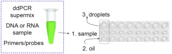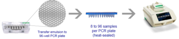 第一,加样和生成微滴:将样本和PCR反应液加入微流控芯片,放入仪器中,仪器可通过物理方法生成单层平铺的20000~30000个微滴阵列。 第二,对每个微滴进行PCR扩增:在Naica Geode微滴生成扩增系统自动进行PCR扩增。 第三,读取和分析结果:将芯片置于Prism微滴读取分析系统上进行荧光信号采集,计数阴阳性微滴,通过泊松分布计算获得靶标基因绝对拷贝数浓度。