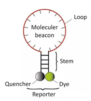 2)SYBR荧光染料: 在PCR反应体系中,加入过量SYBR荧光染料,SYBR荧光染料非特异性地掺入DNA双链后,发射荧光信号,而不掺入链中的SYBR染料分子不会发射任何荧光信号,从而保证荧光信号的增加与PCR产物的增加完全同步。SYBR仅与双链DNA进行结合,因此可以通过溶解曲线,确定PCR反应是否特异。 3)分子信标 是一种在5和3末端自身形成一个8个碱基左右的发夹结构的茎环双标记寡核苷酸探针,两端的核酸序列互补配对,导至荧光基团与淬灭基团紧紧靠近,不会产生荧光。 PCR产物生成后,退火过程中,分子信标中间部分与特定DNA序列配对,荧光基因与淬灭基因分离产生荧光。 第二代PCR主要缺点: