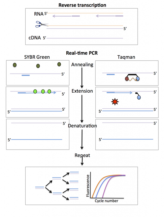 1)TaqMan荧光探针: PCR扩增时在加入一对引物的同时加入一个特异性的荧光探针,该探针为一寡核苷酸,两端分别标记一个报告荧光基团和一个淬灭荧光基团。 探针完整时,报告基团发射的荧光信号被淬灭基团吸收;PCR扩增时,Taq酶的5'-3'外切酶活性将探针酶切降解,使报告荧光基团和淬灭荧光基团分离,从而荧光监测系统可接收到荧光信号,即每扩增一条DNA链,就有一个荧光分子形成,实现了荧光信号的累积与PCR产物形成完全同步。